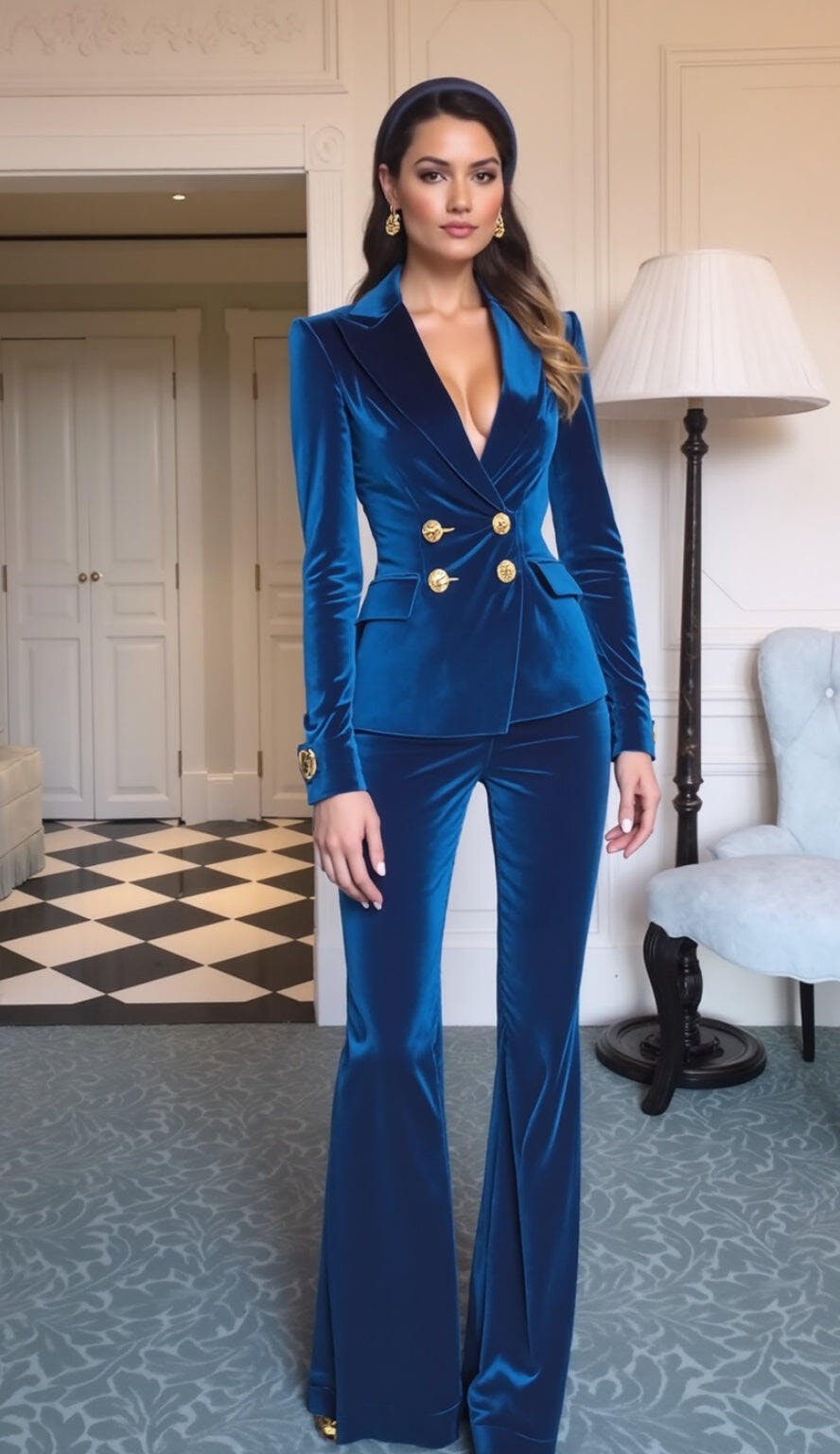 2 Piece Royal Blue Velvet Peak Lapel Women Prom Suits with Sleeves