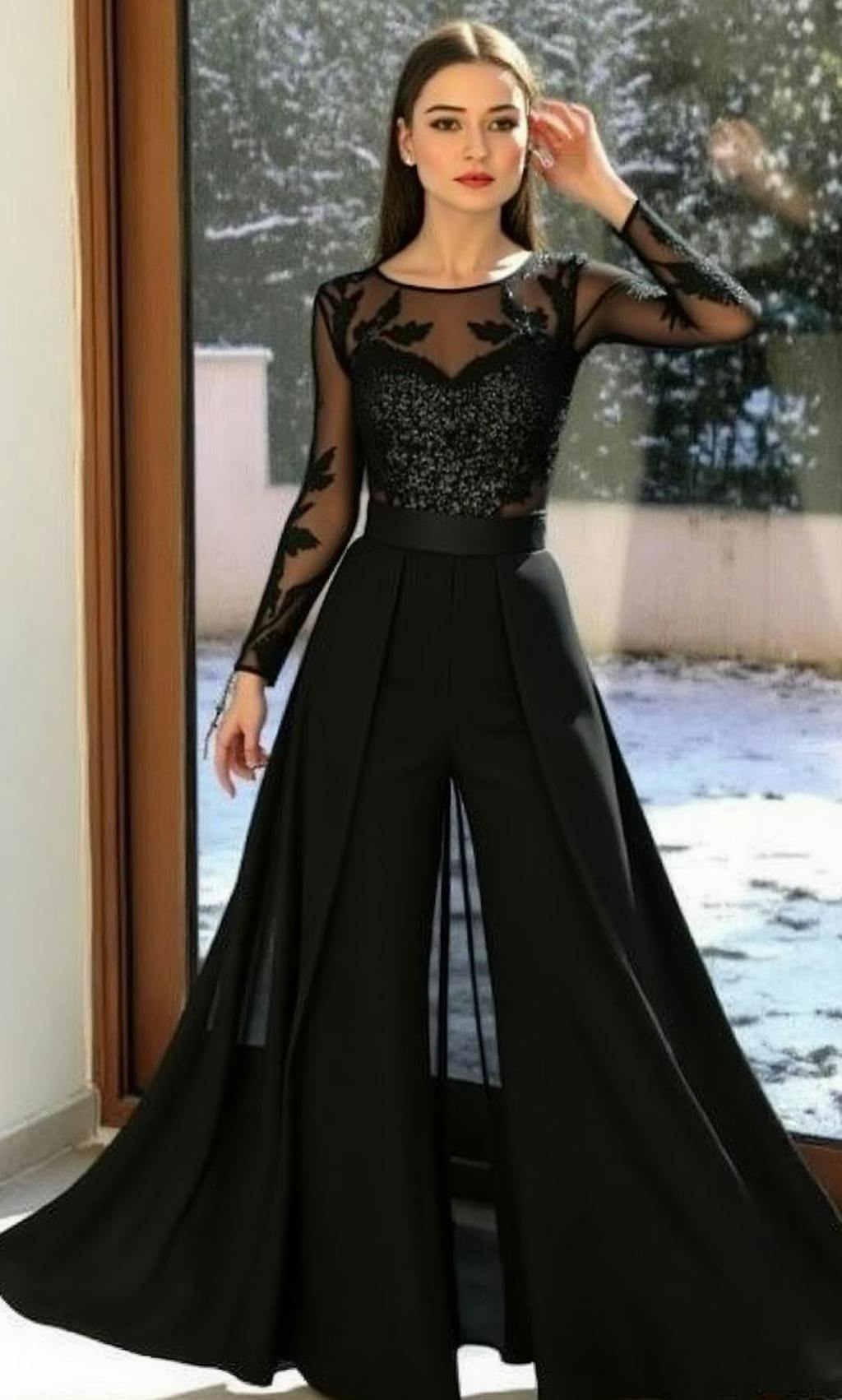 Black A Line Chiffon Long Mother of the Bride Jumpsuits with Lace