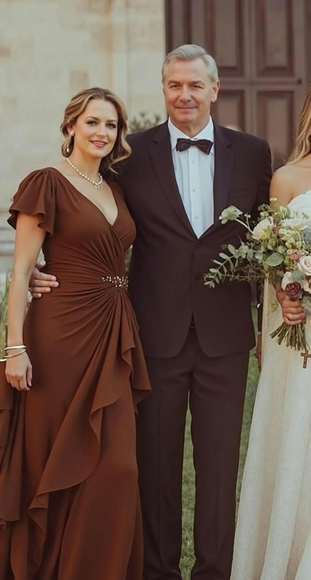 Featured: This navy chiffon mother-of-the-bride dress features a flattering V-neckline and a graceful A-line silhouette. Soft ruffles cascade along the skirt, while delicate ruching shapes the bodice, creating an elegant and refined look with gentle movement.
