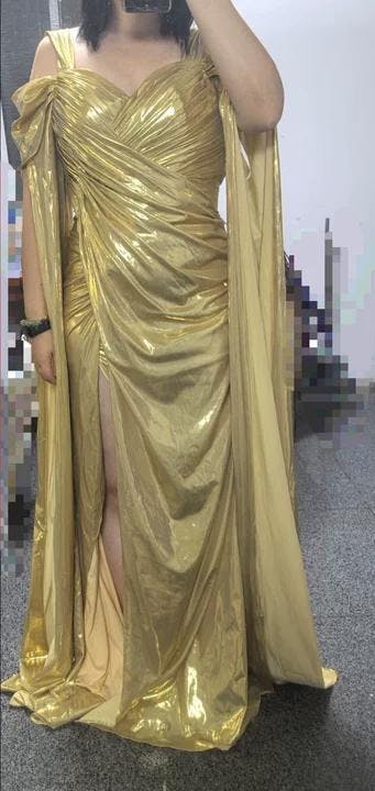 Golden Cold Shoulder Metallic Long Gala Dress with Slit