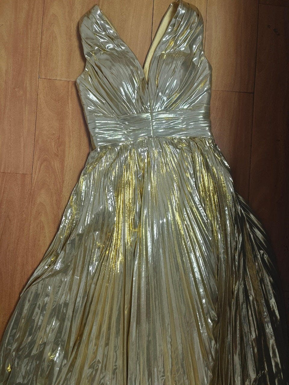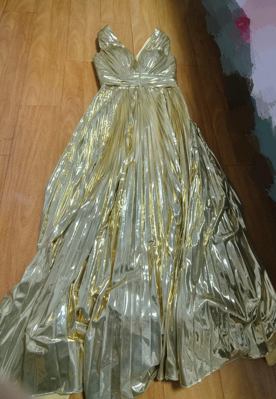 Sparkly Gold Metallic Pleated V-Neck A-Line Long Formal Dress