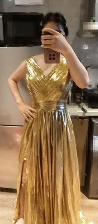 Sparkly Gold Metallic Ruched V-Neck A-Line Long Formal Dress with Slit