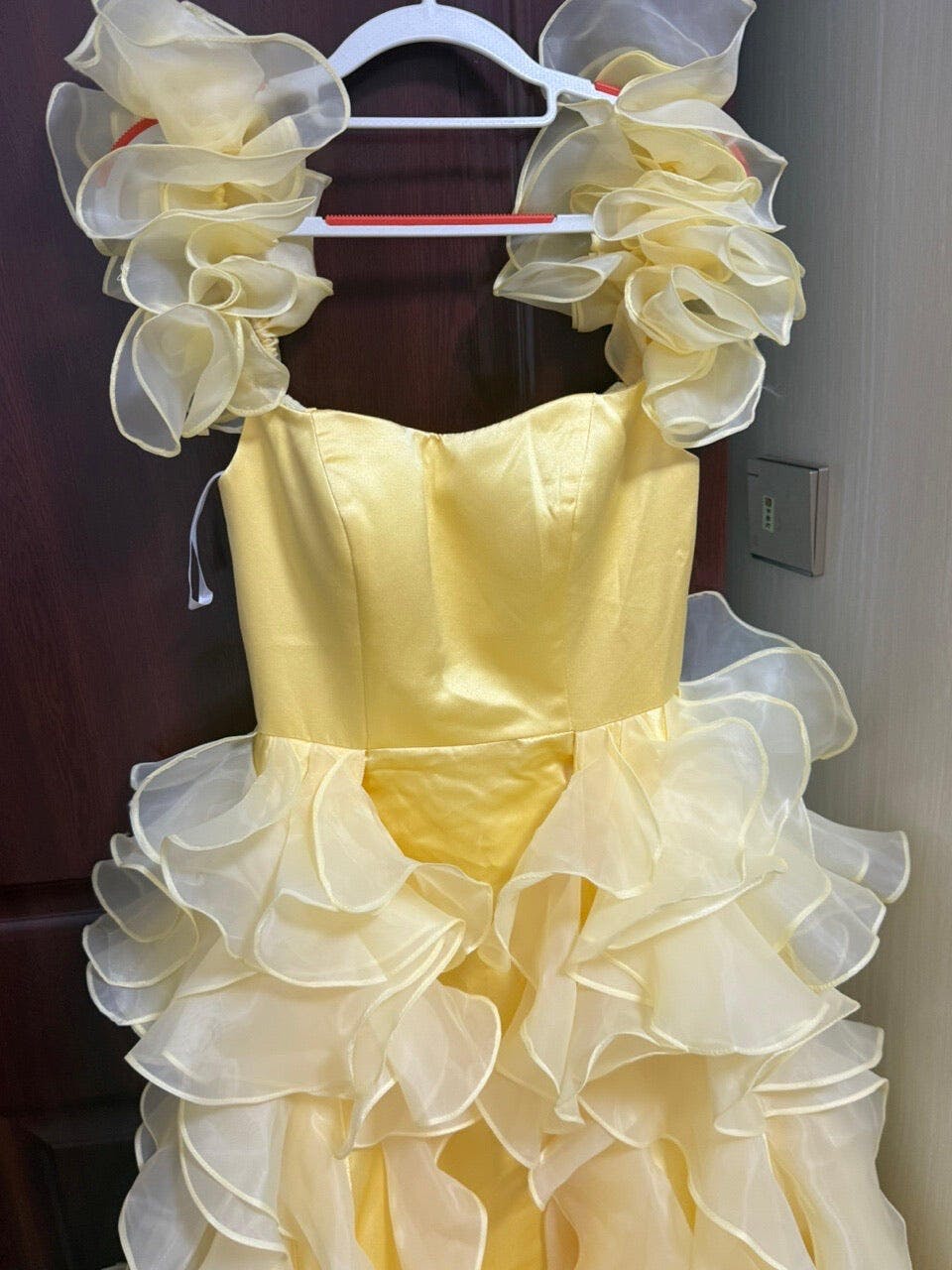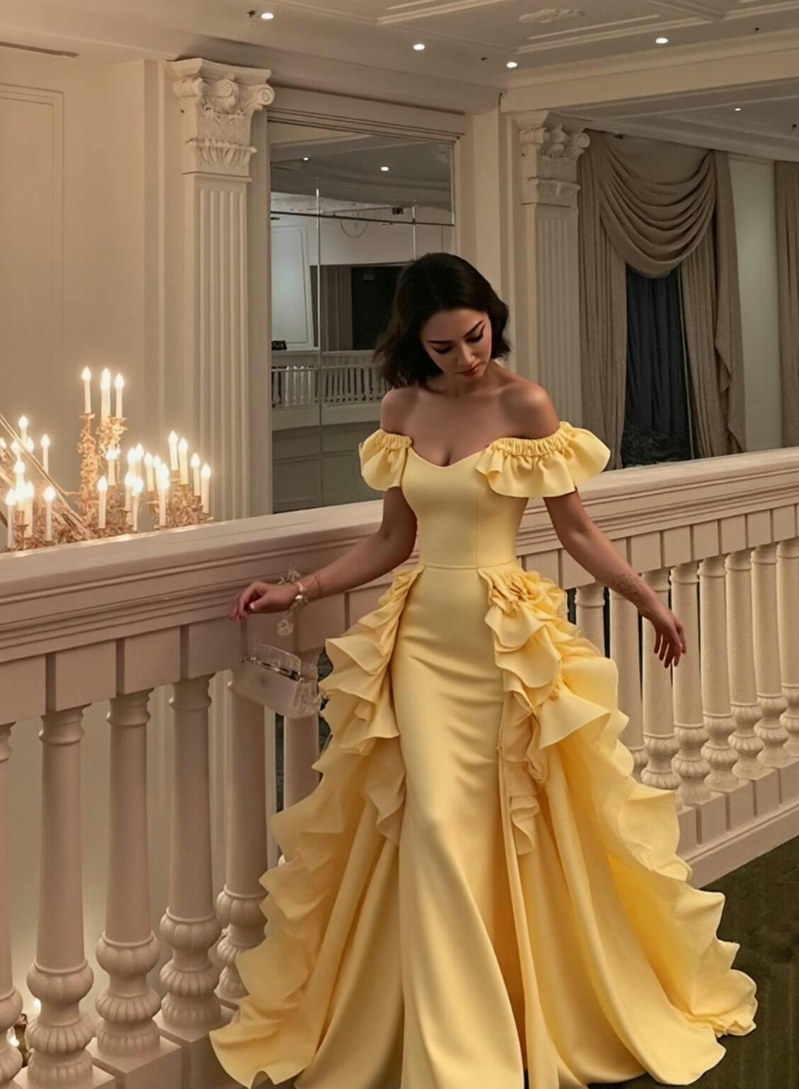 Yellow Satin Long Off the Shoulder Prom Dress with Ruffles