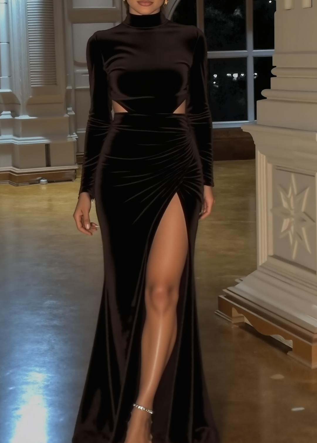 Black Velvet Cut Out High Neck Long Sleeves Holiday Party Dress with Slit