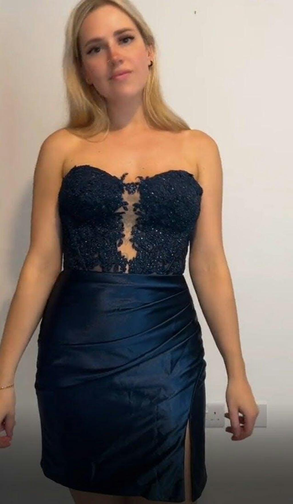 Details: Glamorously dance the night away in our Sparkly Navy Tight Homecoming Dress! Its strapless design and tight, short fit will show off your figure, while the lace detailing adds an elegant touch. With a playful slit, you'll be sure to turn heads on the dance floor. Perfect for a fun and flirty evening.