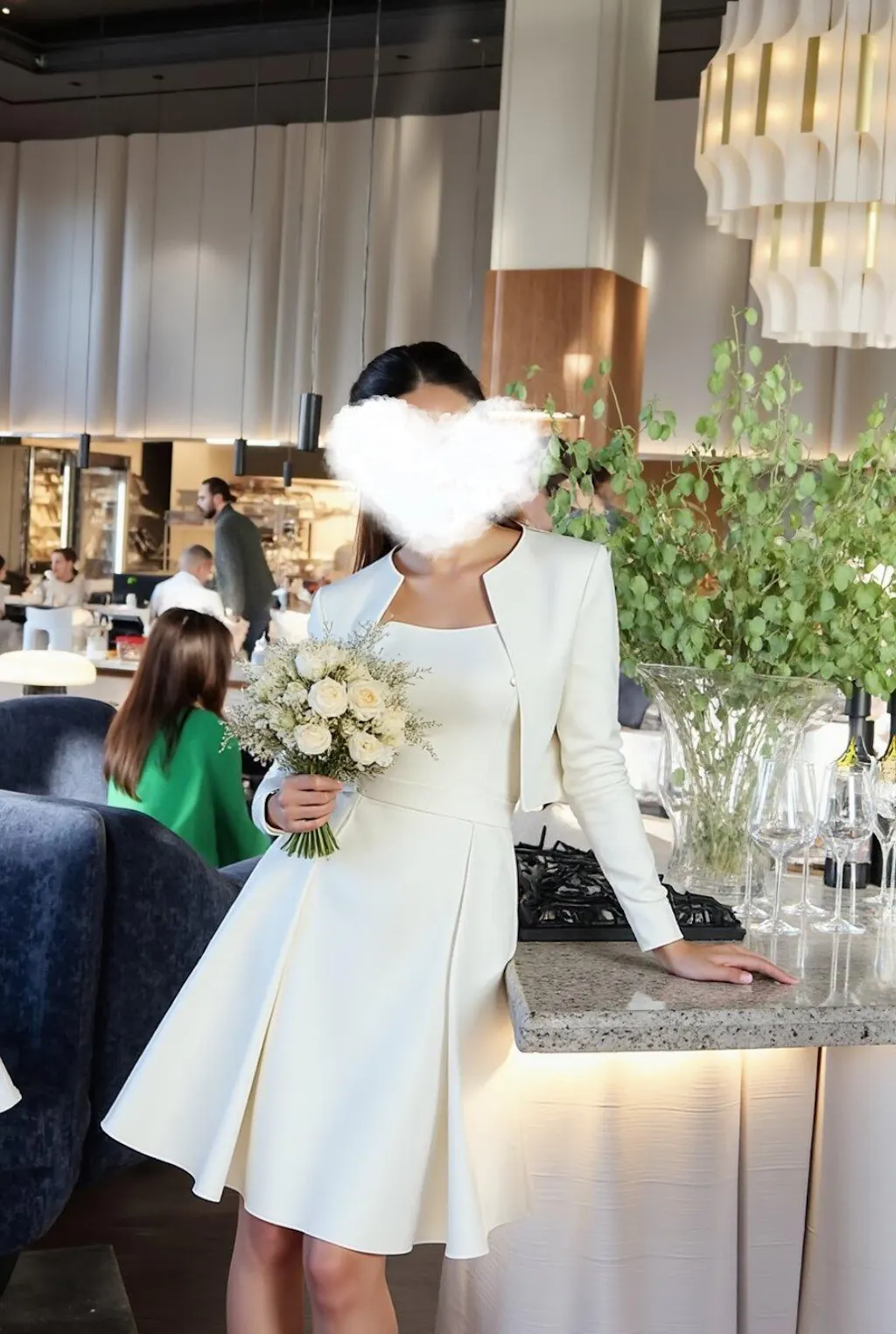 Featured: This ivory two-piece wedding set features a satin midi dress with a boat neckline and subtle ruching, paired with a tailored long-sleeved jacket. The A-line silhouette flows gracefully, offering a refined and versatile bridal look suitable for special occasions.
