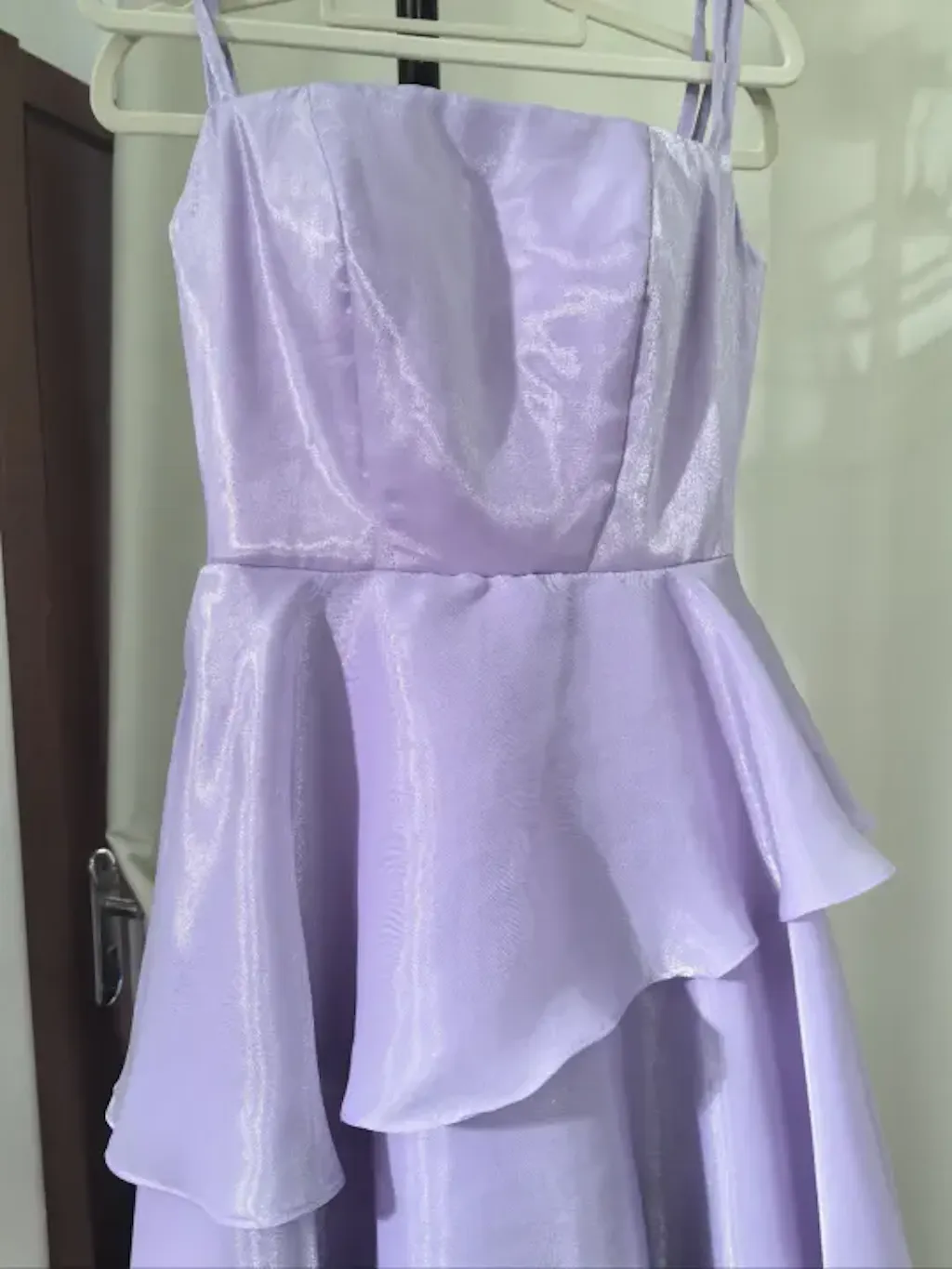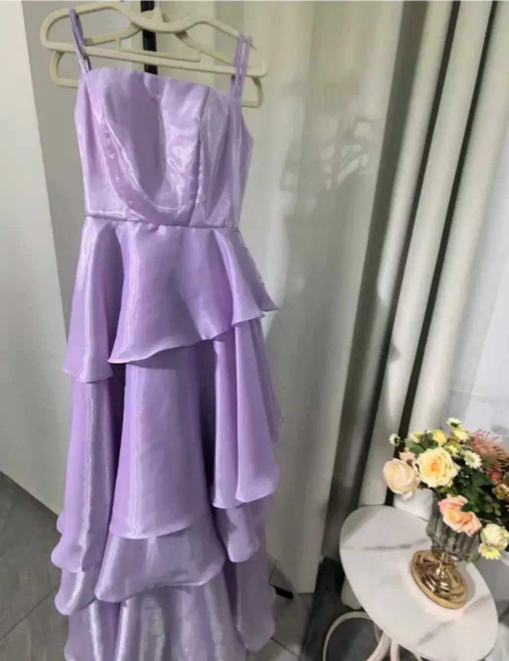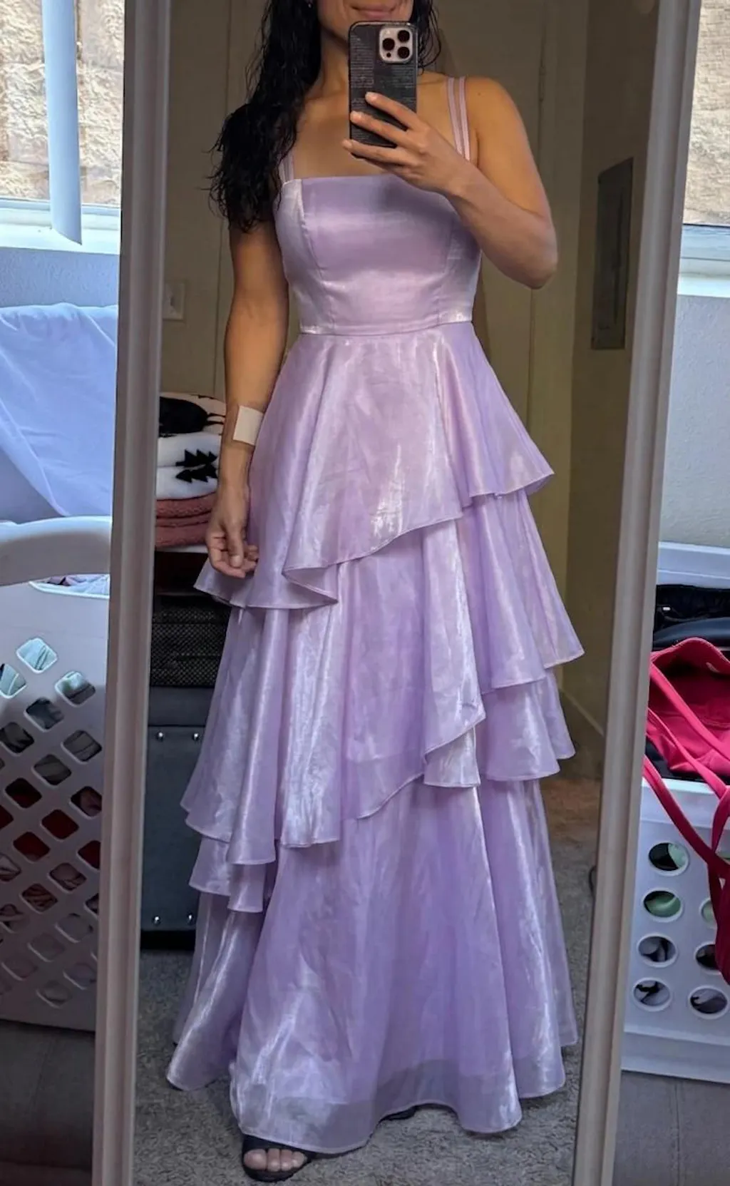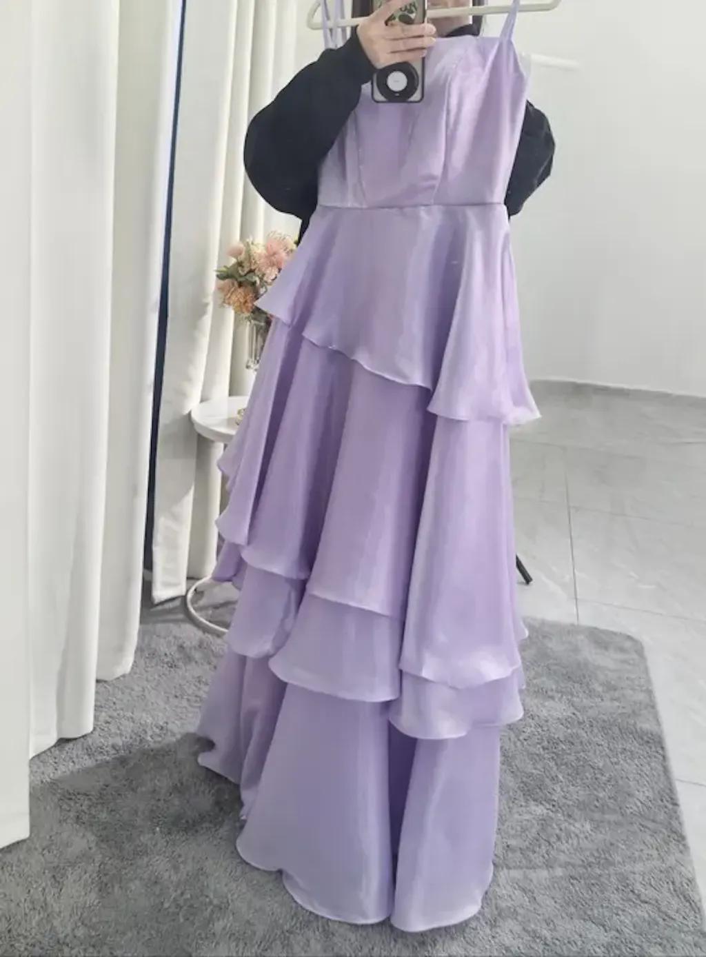 Feature: This light blue satin dress features a square neckline and is designed in a romantic A-line silhouette with tiered ruffled layers. The lustrous fabric drapes beautifully, creating an elegant and feminine look perfect for wedding guests and formal occasions.
