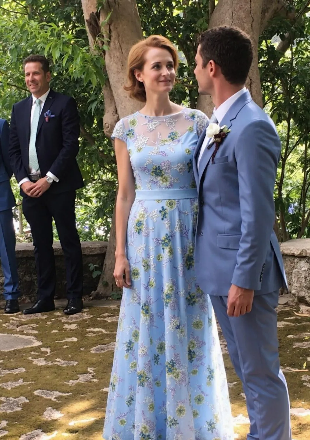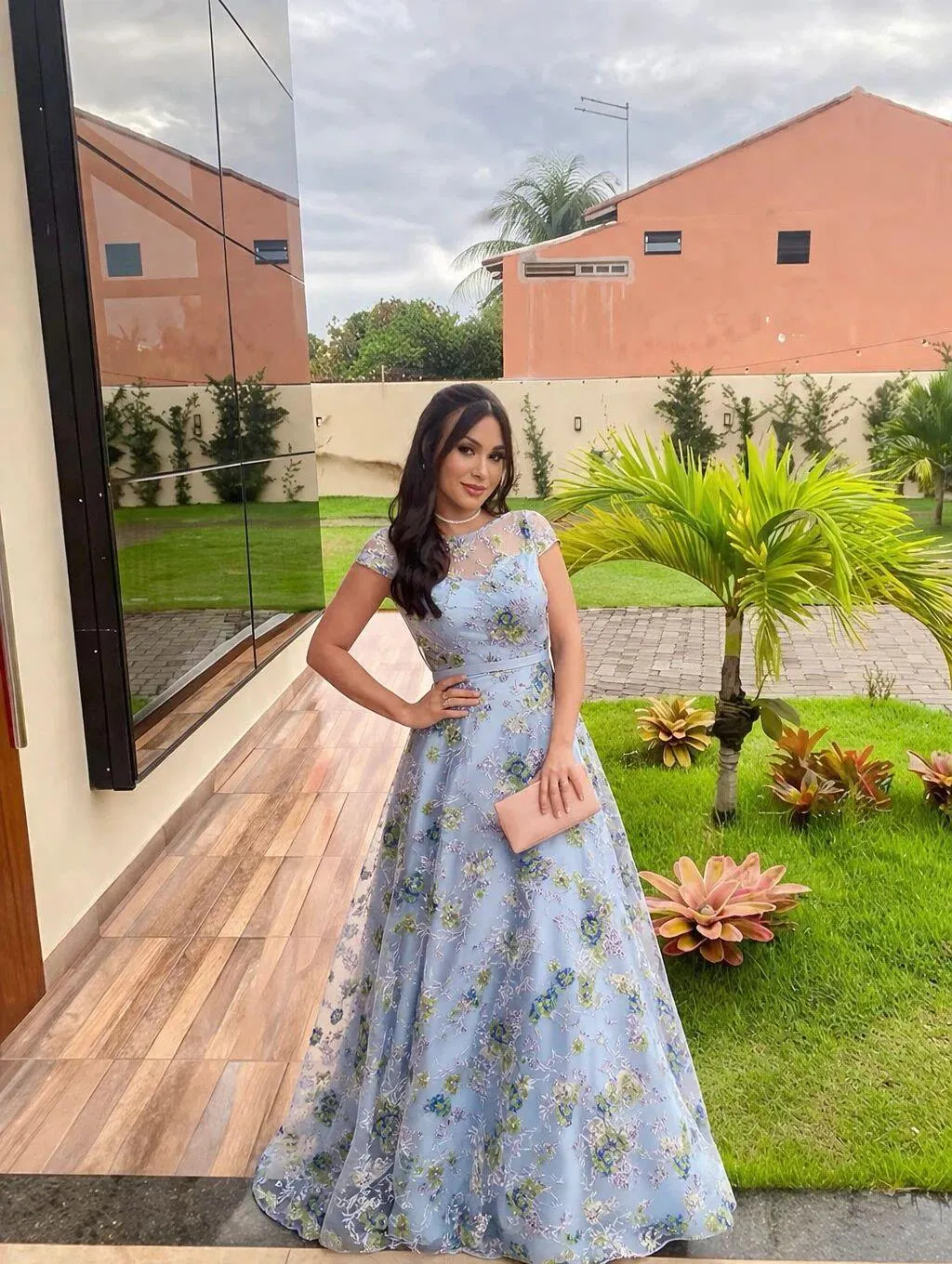 Fabric: This blue floral gown features short sleeves and an illusion round neckline, designed in an elegant A-line silhouette. Delicate appliques scatter gracefully across the entire dress, while the flowing fabric drapes softly for a refined and cohesive formal look.