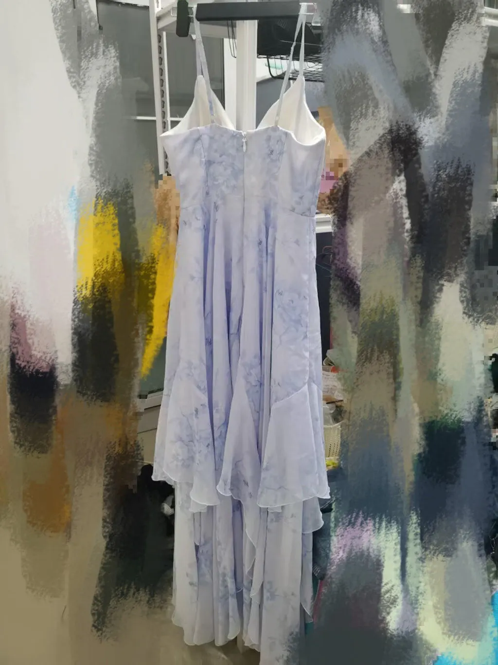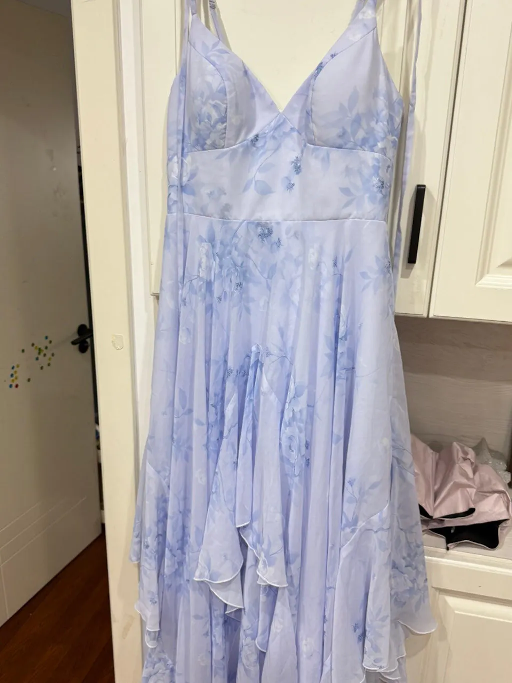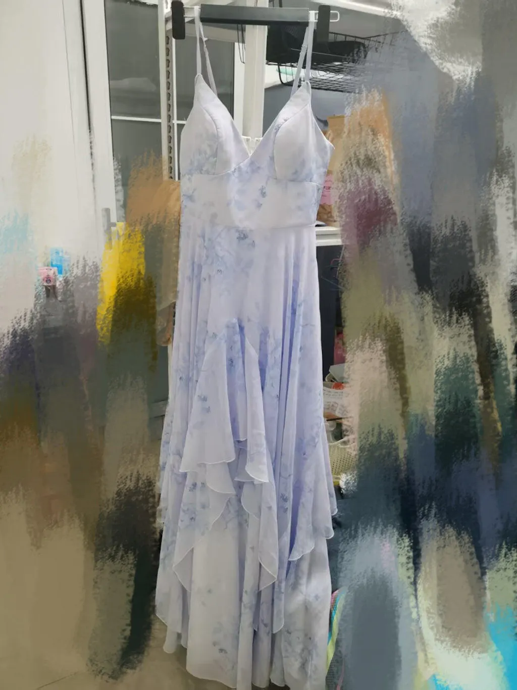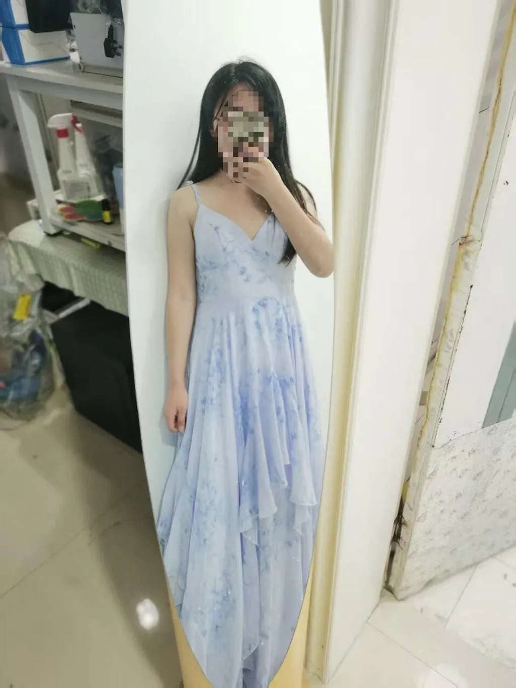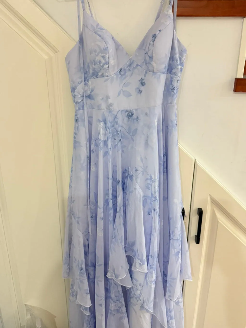Blue Floral Ruffled Spaghetti Straps Long Chiffon Bridesmaid Dress