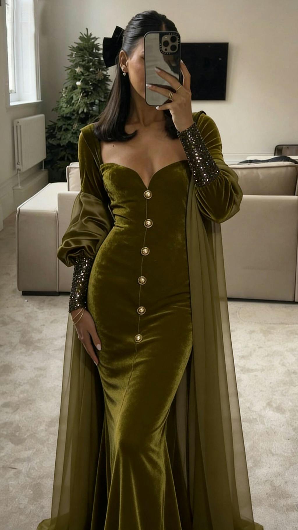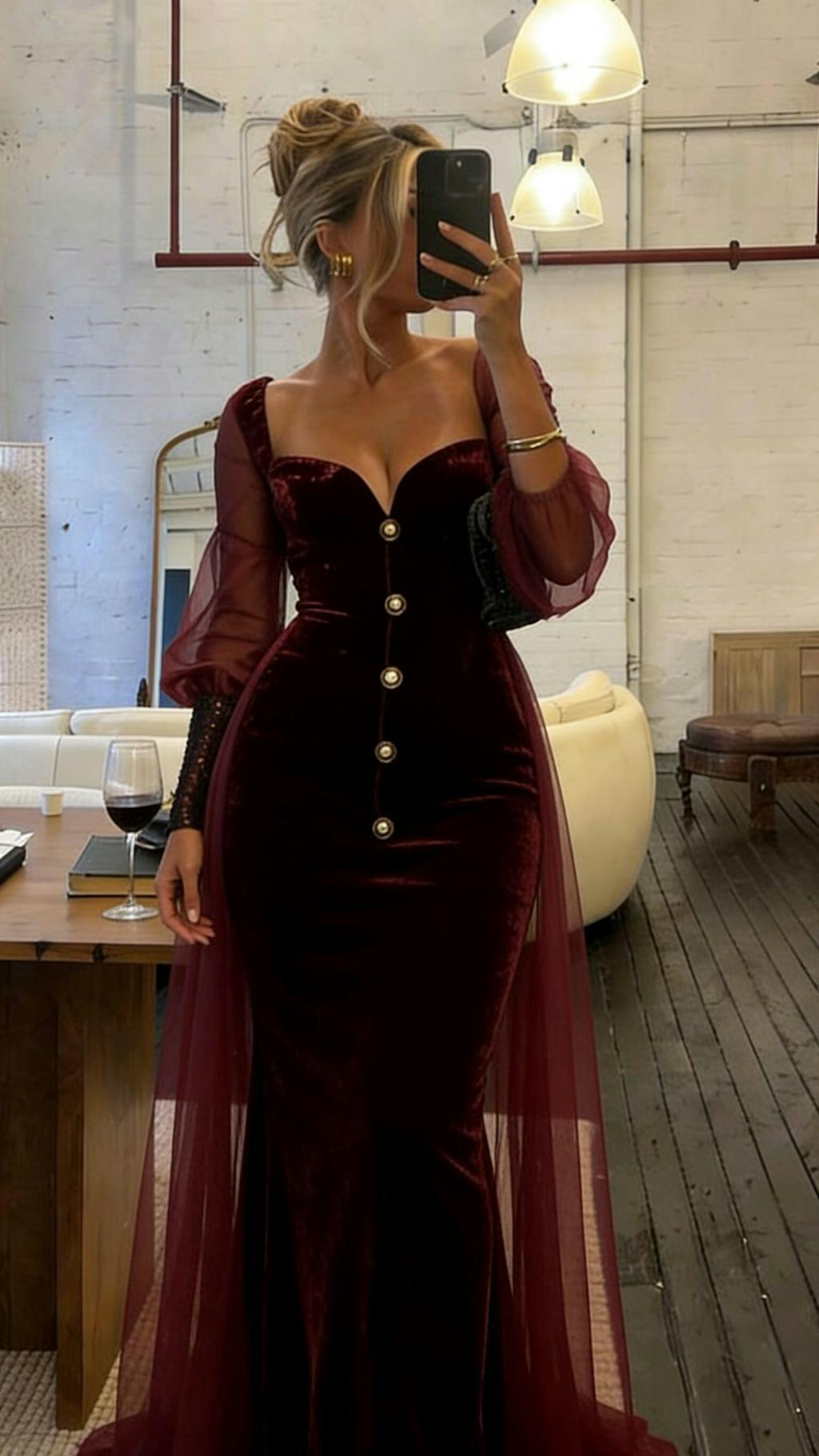 Featured: This burgundy velvet formal gown features puff sleeves and a dramatic tulle cape, fastened with delicate buttons. The rich fabric drapes smoothly, while the voluminous sleeves and flowing cape create a bold, romantic statement for evening wear.