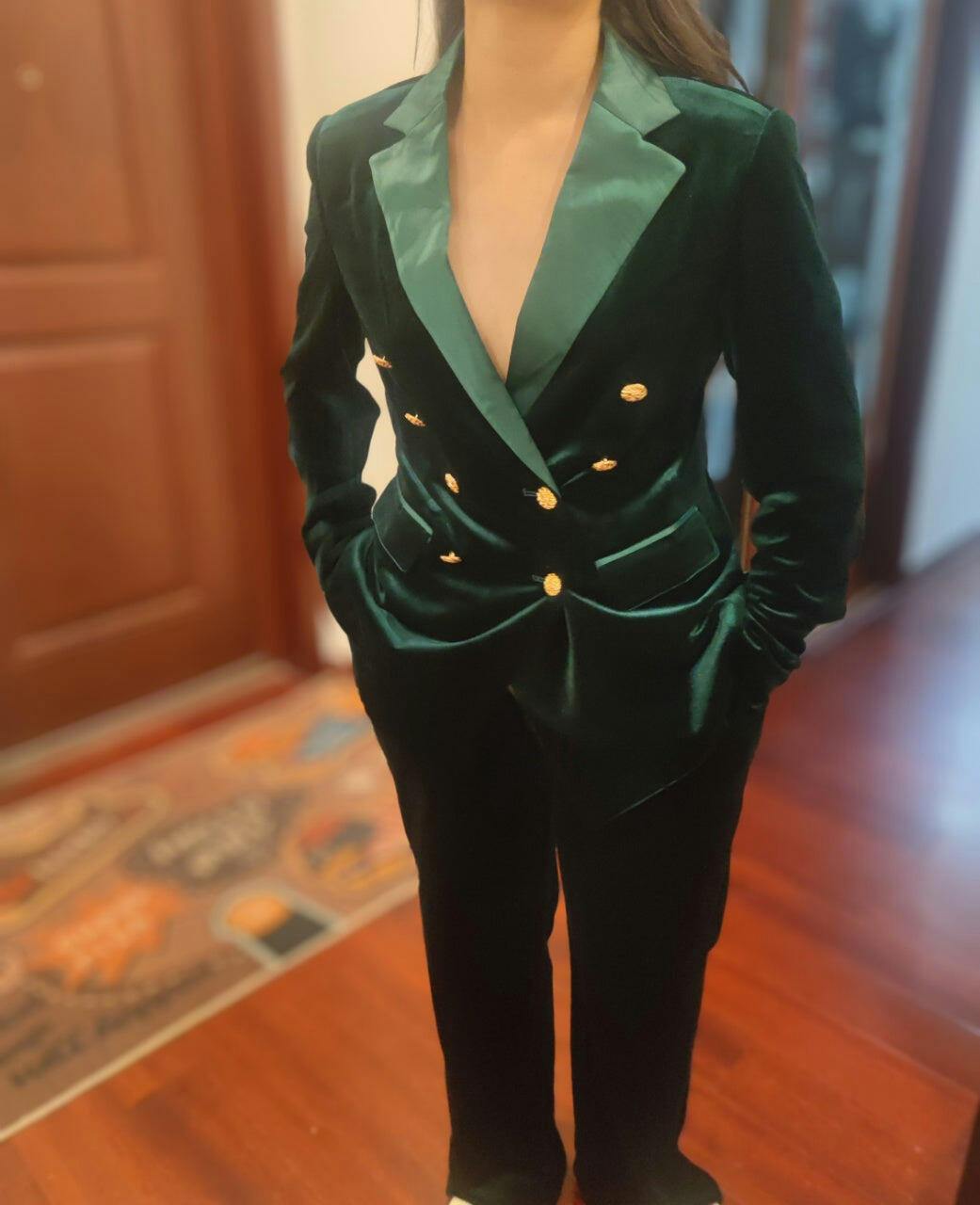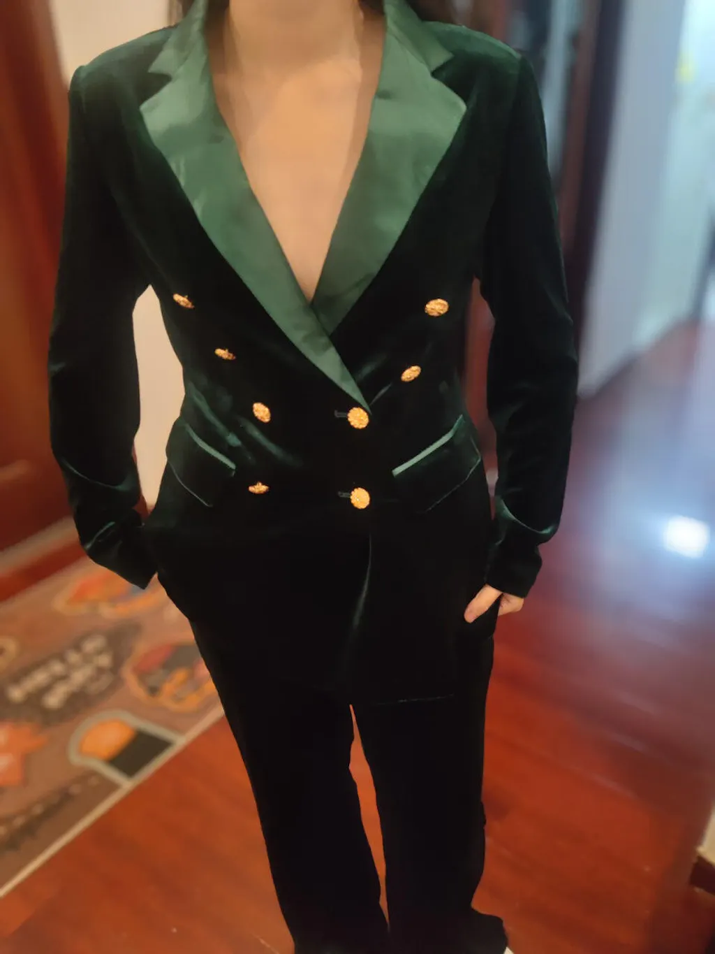 Dark Green Velvet Double Breasted 2 Piece Women Prom Suits with Sleeves