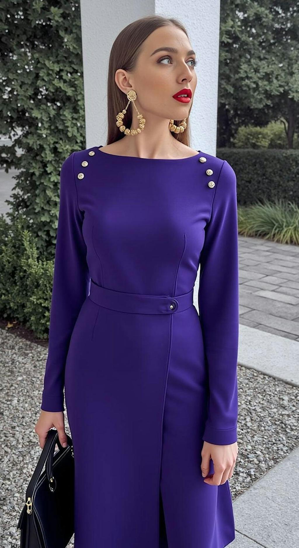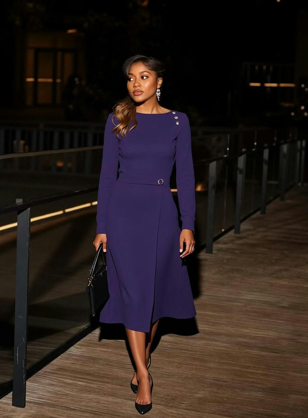 Dark Purple Long Sleeves Midi Work Dress with Buttons