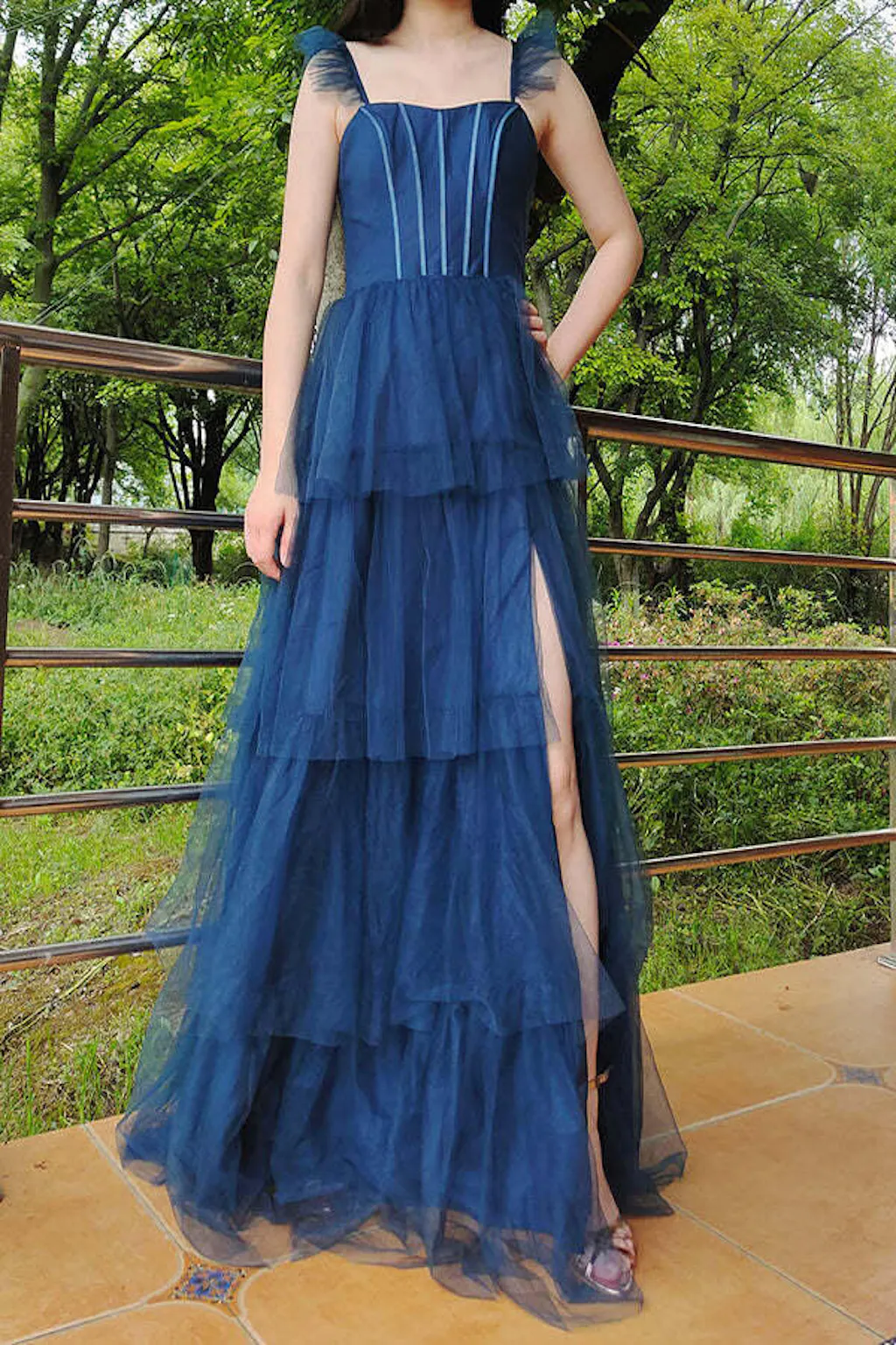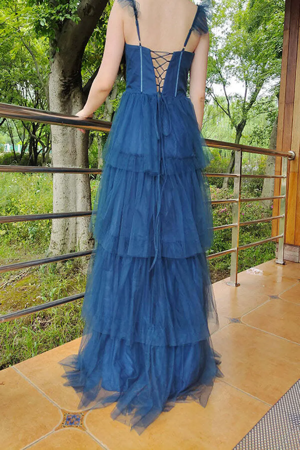 Detachable Straps A Line Tiered Long Dusty Blue Bridesmaid Dress