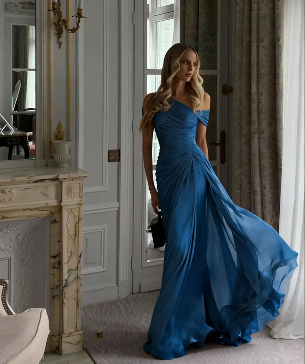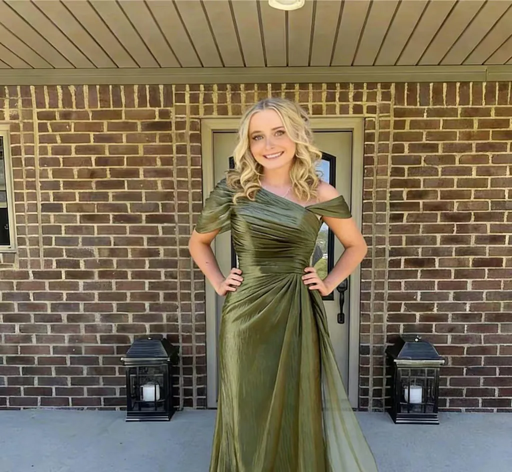 Dusty Sage Chiffon A Line Ruched Long Formal Dress with Side Cape