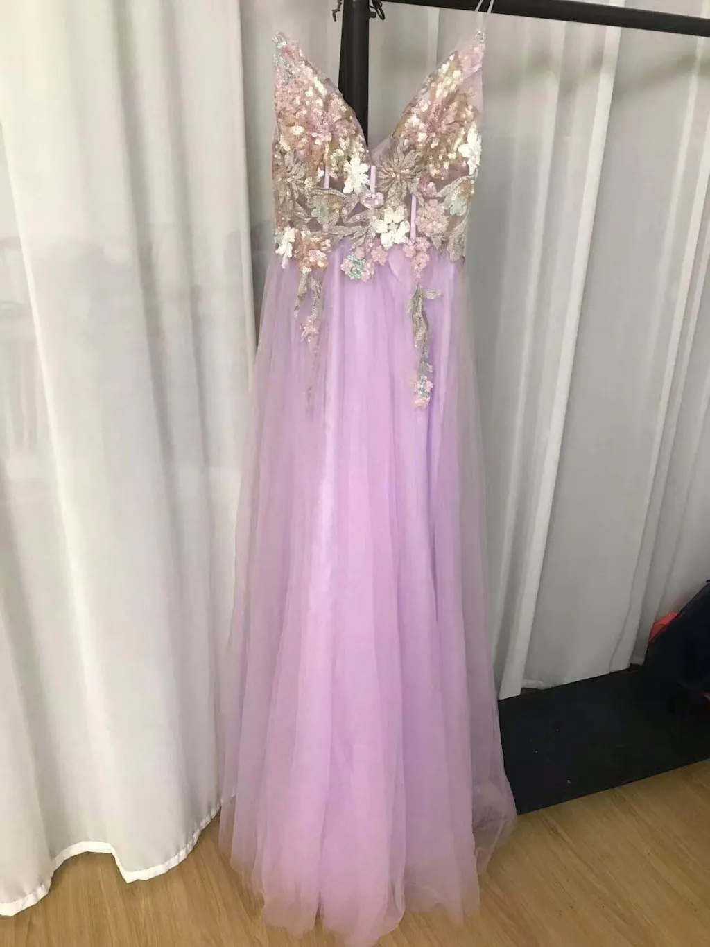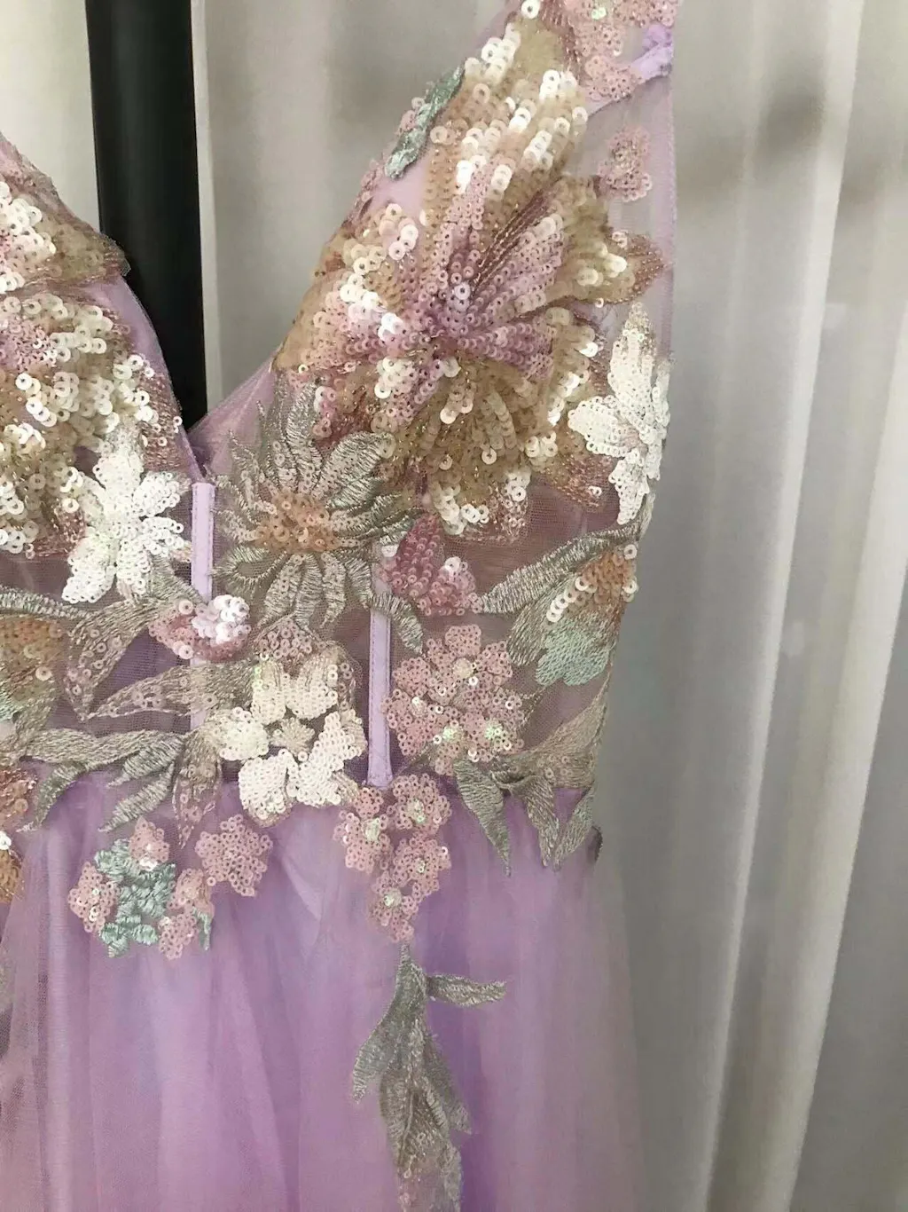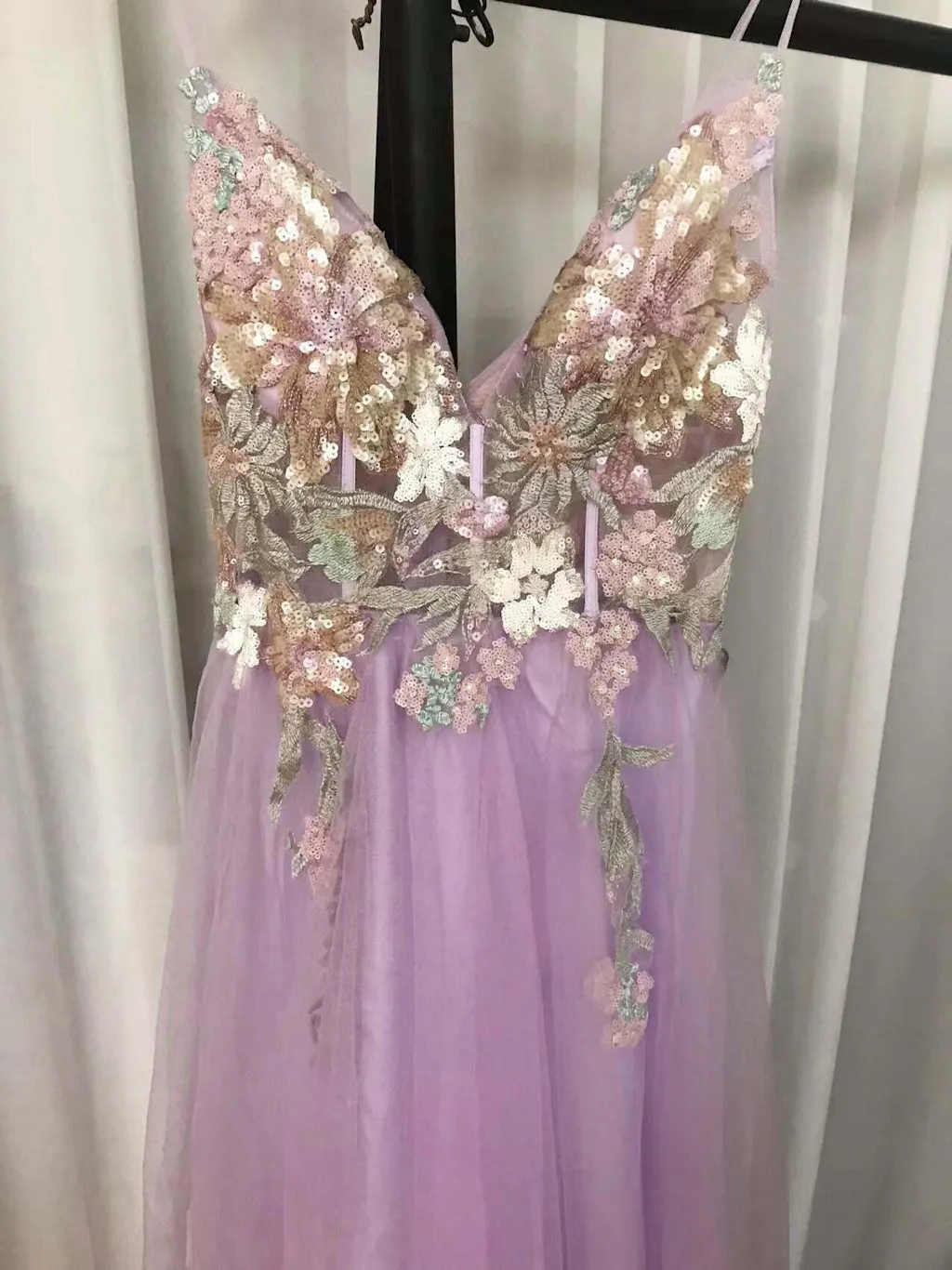 Glitter A-Line Spaghetti Straps Lilac Long Prom Dress with Flowers
