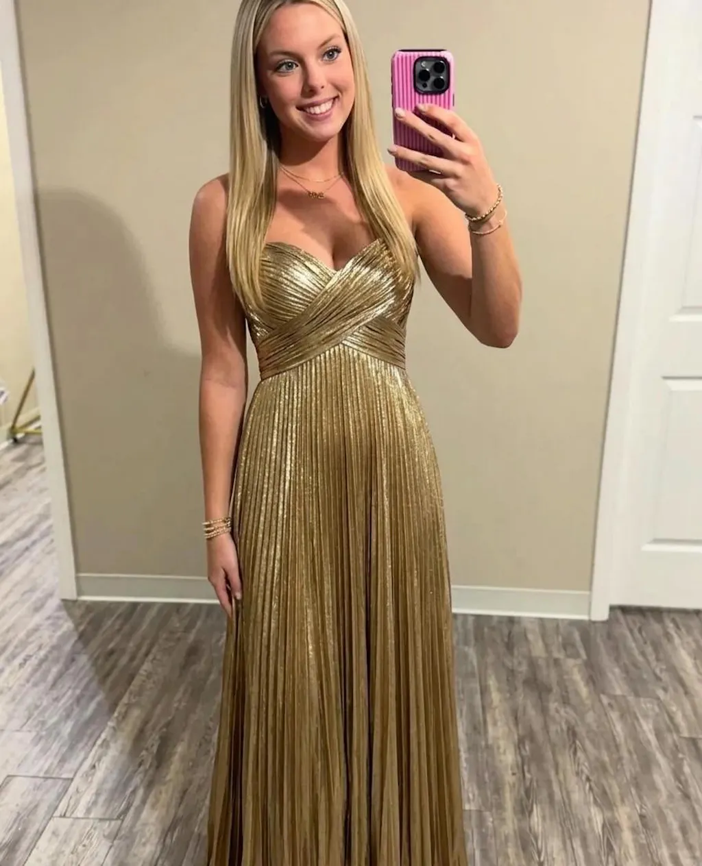 Gold Sweetheart Metallic A-Line Pleated Long Prom Dress