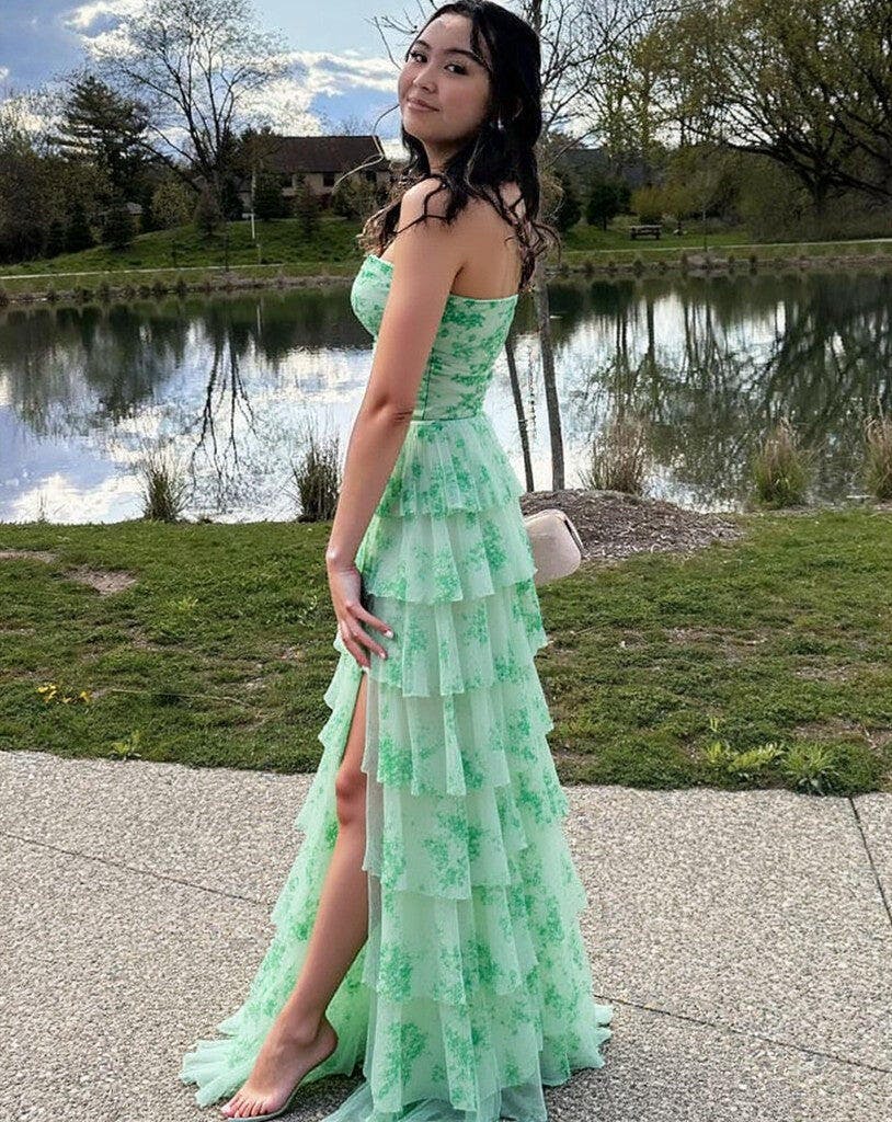 Green Floral A-Line Tiered Strapless Long Prom Dress with Slit
