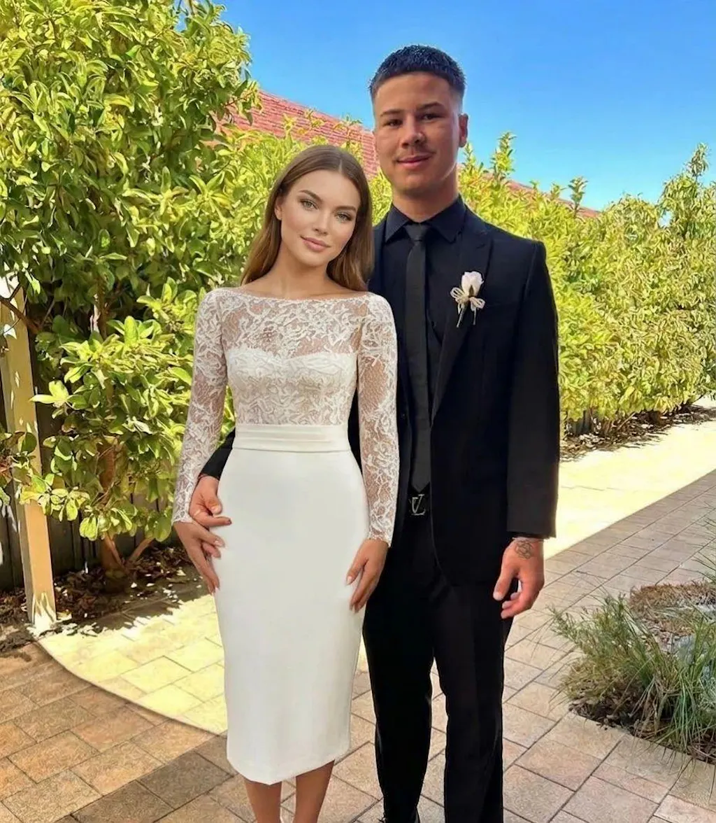 Featured: This ivory lace wedding dress features a bateau neckline and long sleeves, crafted in a fitted bodycon silhouette that falls to a midi length. Delicate lace detailing lends timeless texture, creating a refined and romantic look.