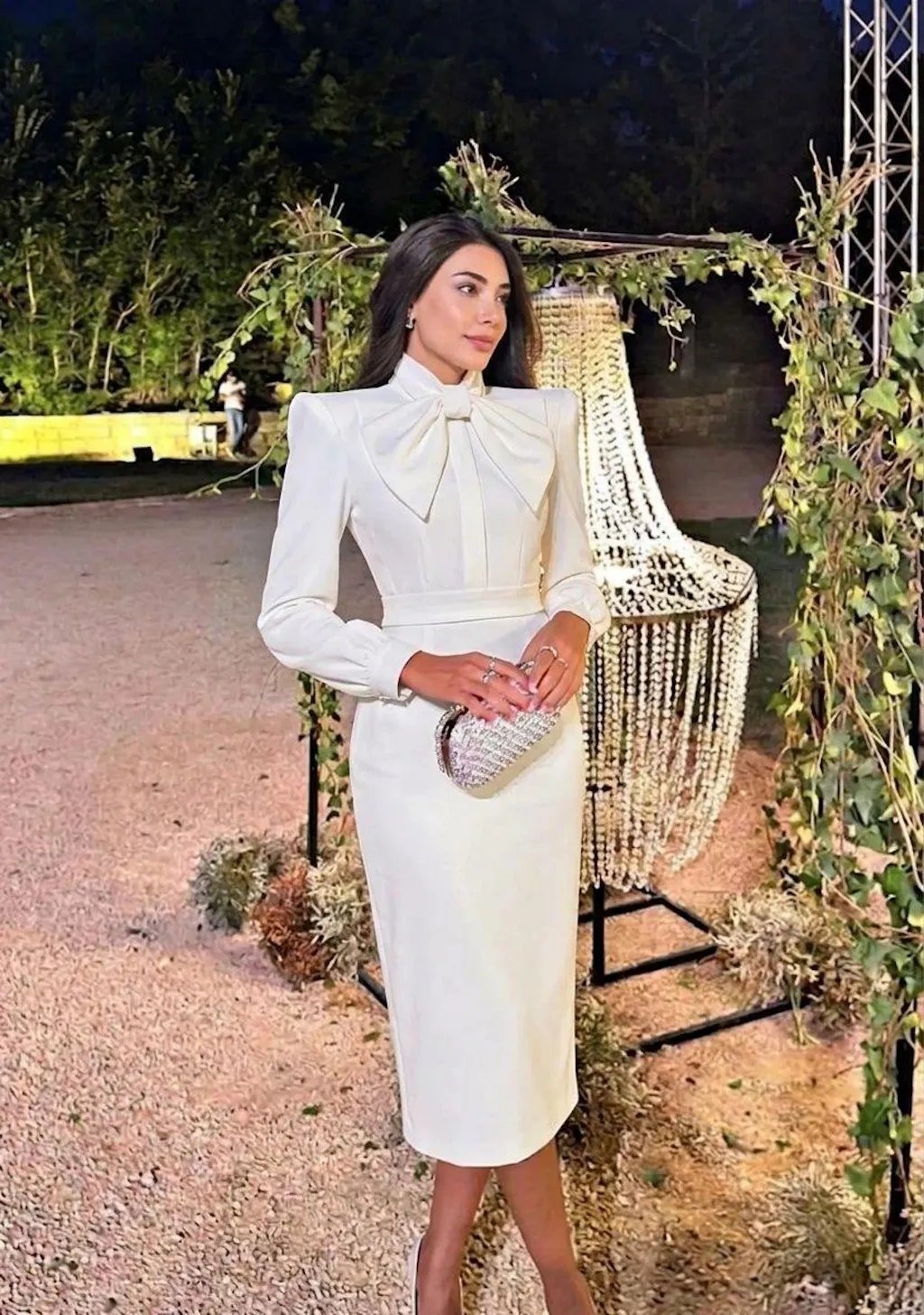 Feature: This ivory work dress features a high neckline and long sleeves, tailored in a sleek pencil silhouette. A delicate bow accent adorns the neck, adding a refined touch to the sophisticated, business-appropriate design.