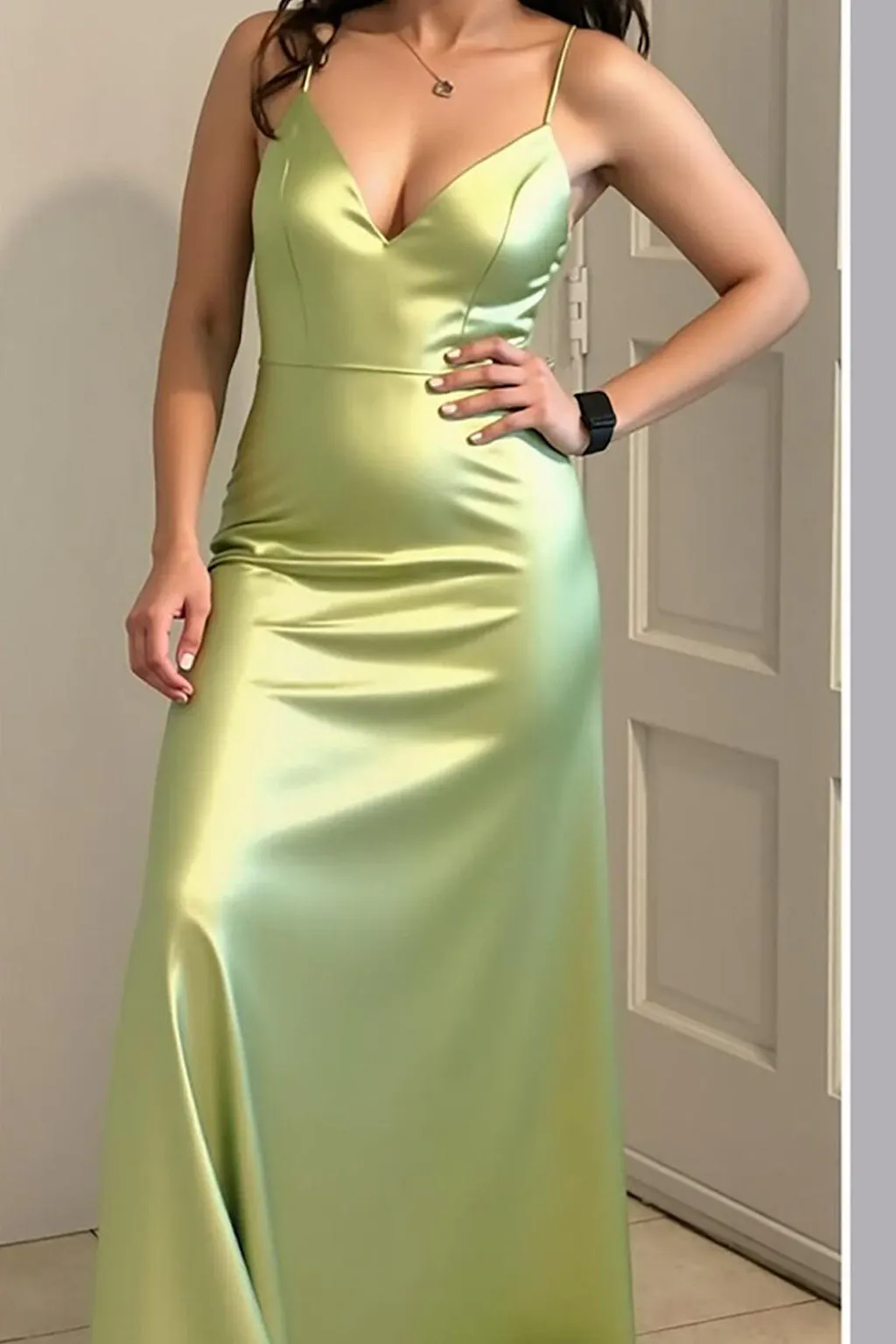 Lemon Green Satin V-Neck Sheath Spaghetti Straps Long Prom Dress