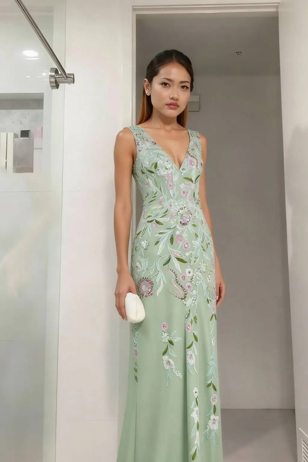 Details: This light green floral prom gown features a V-neckline and a sleek sheath silhouette, elegantly adorned with delicate appliques. The smooth fabric drapes gracefully, creating a fresh and refined look for formal occasions.