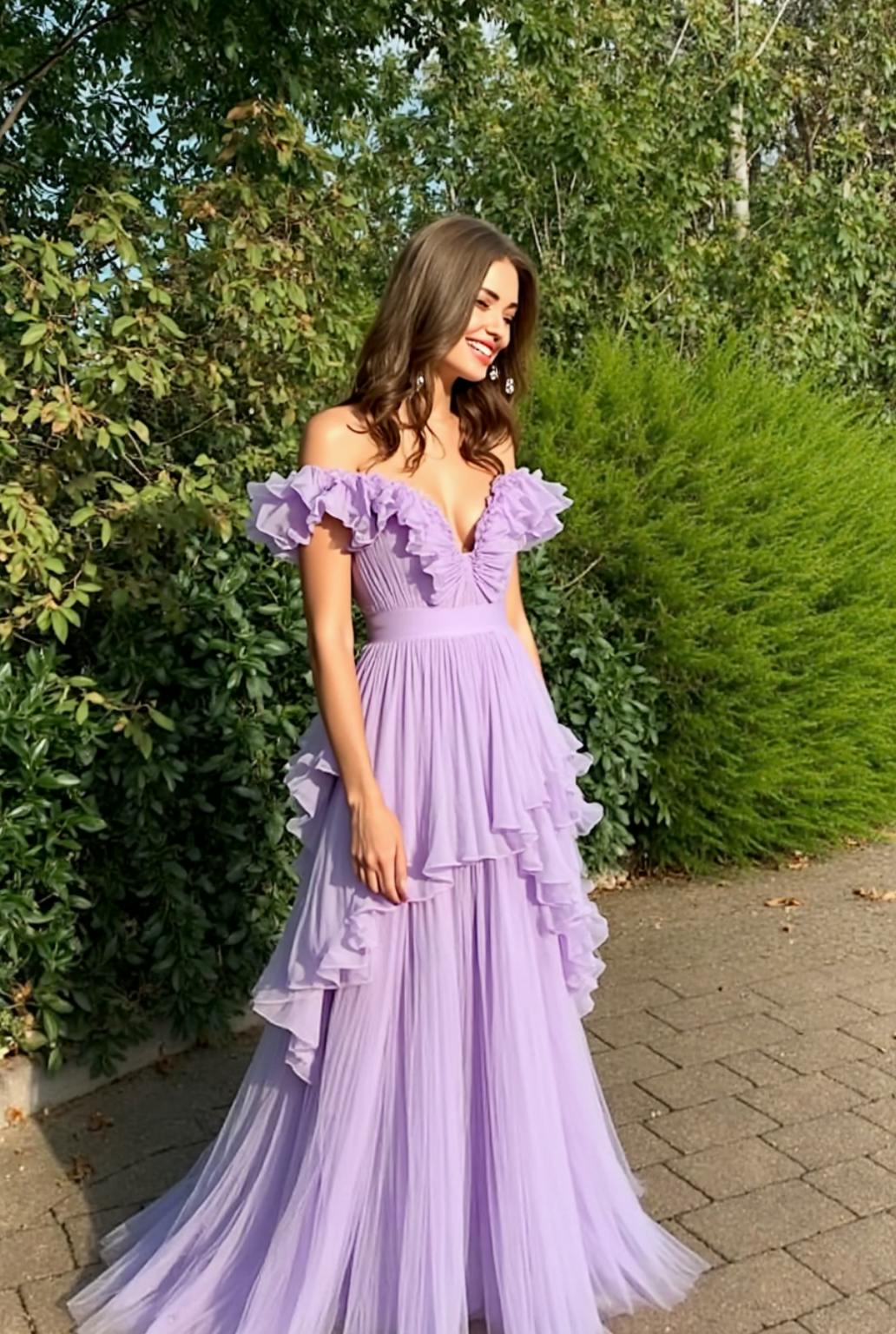 Occasion:  This Lilac Chiffon Ruffled Off the Shoulder Prom Dress also can suitable for Prom, Party, Bridesmaid, Black Tie, Formal, Evening, Black Tie Wedding Guest, Wedding Party, Formal Wedding Guest, Pageant, Birthday, Causal Wear and other various prom occasions.