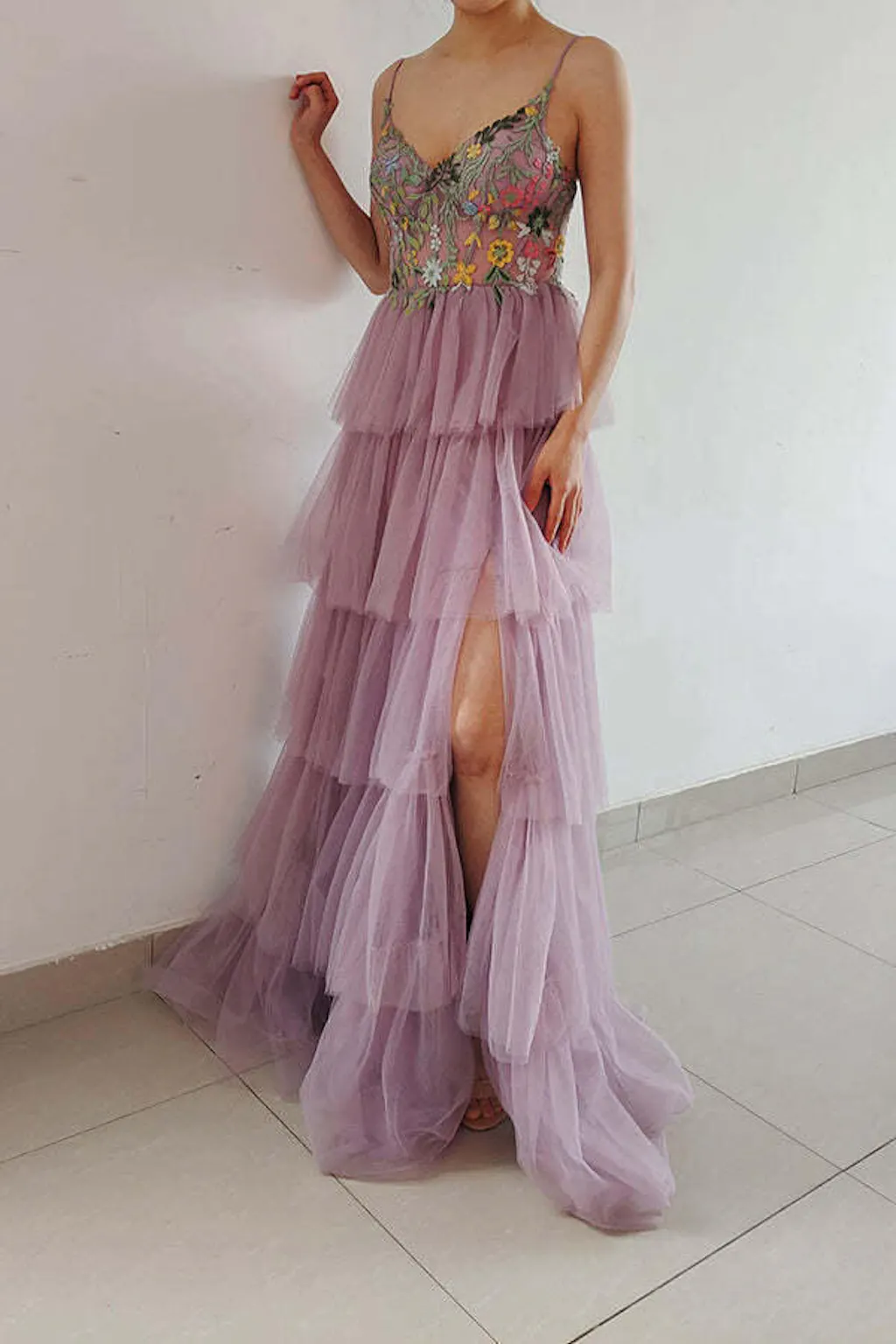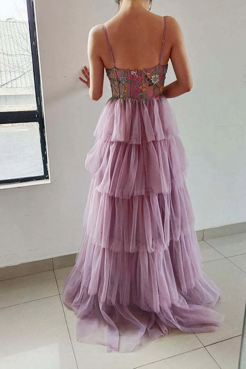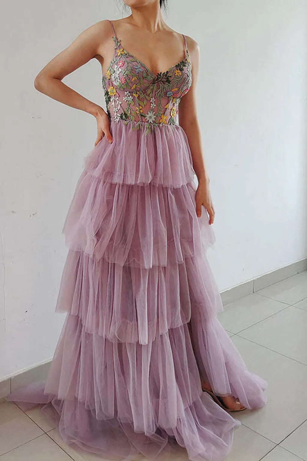 Mauve A-Line Corset Tiered Long Prom Dress With Appliques