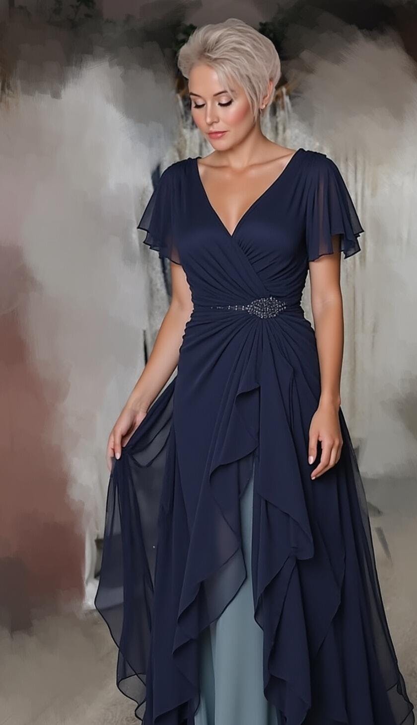 Occasion:This Navy V-Neck Ruffled Long Mother of the Bride Dress also can suitable for Evening, Military Ball, Formal, Black Tie Wedding Guest, Wedding Party, Gala, Mother Dress, Wedding Guest Dress, Prom, Formal Wedding Guest and other various formal occasions.