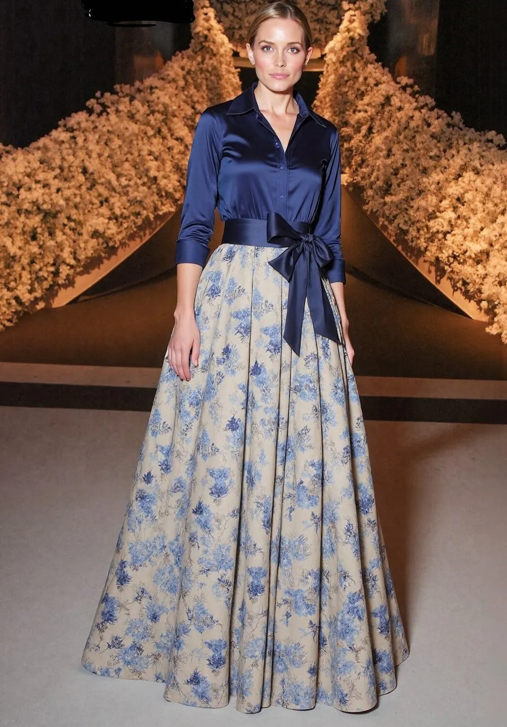 Fabric: This navy floral jacquard gown features a shirt collar and three-quarter sleeves, designed in a graceful A-line silhouette. A delicate bow accents the waist, while the intricately woven fabric drapes elegantly for a refined and polished look.