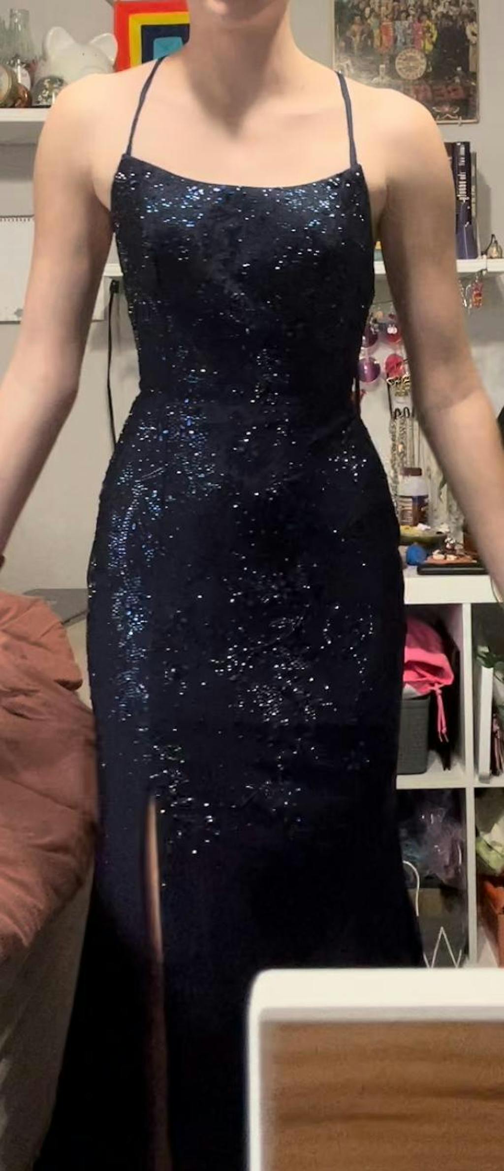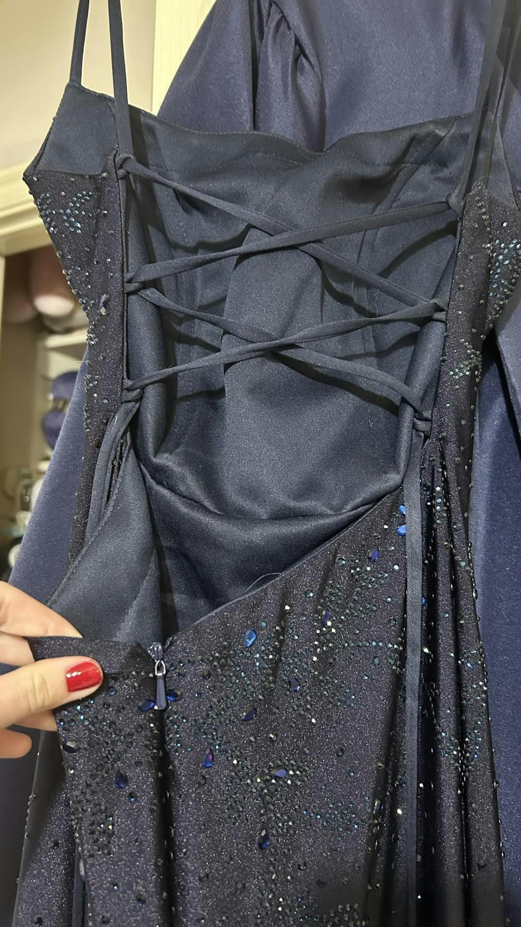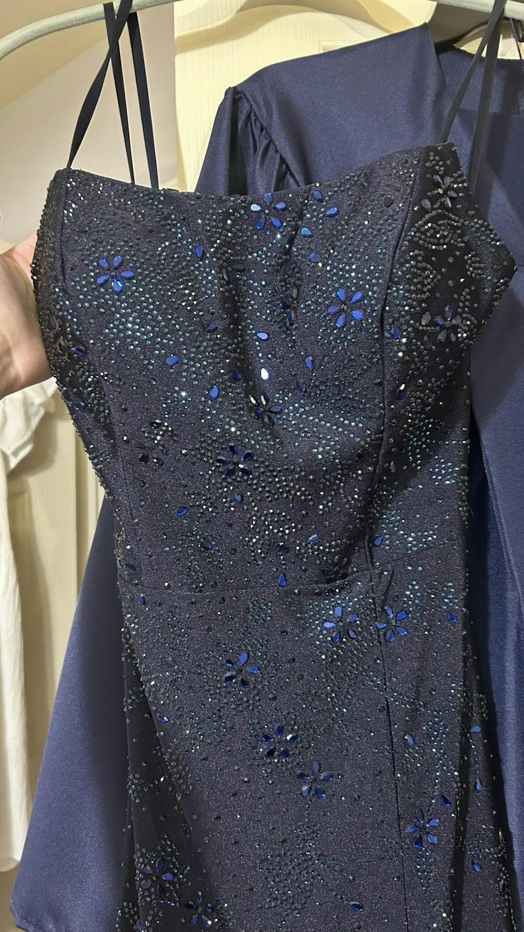 The gems are beautiful and sparkly and just like the website photos. The fabric isn’t the highest quality (you get what you pay for so duh) but it’s stretchy, comfortable, not scratchy at all, and looks gorgeous. There are really thick built in cups that don’t quite fit me (despite me putting in my measurements) but it looks fine. The train is much longer than I thought it was, so definitely check that out if it might bother you. The thick hem bit is also really difficult to lay out properly and probably won’t ever look good without someone laying it out/staging it but that’s lowkey to be expected. The straps are very sturdy and so are the corset loops so you don’t have to worry about ripping. It also has those safety ribbon straps for storage/hanging. The zipper is like every other zipper I’ve had on a dress, and it’s pretty short, so very unproblematic.