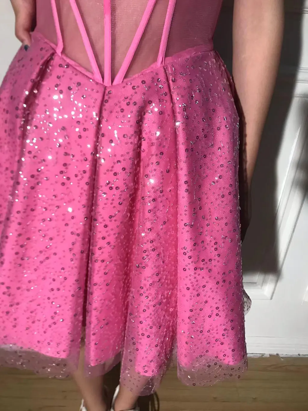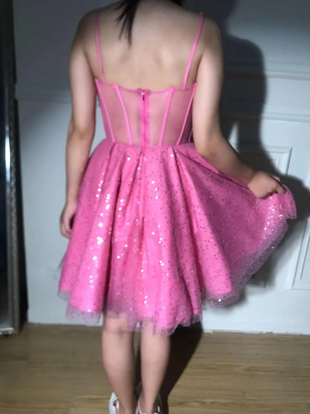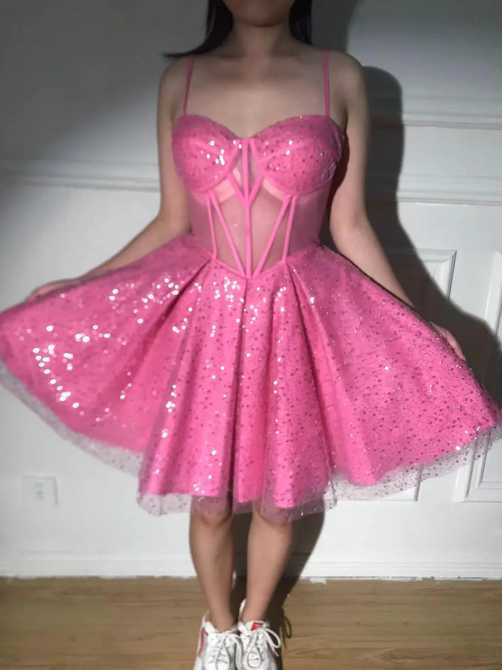 Pink A-Line Spaghetti Straps Corset Cocktail Dress with Sequins