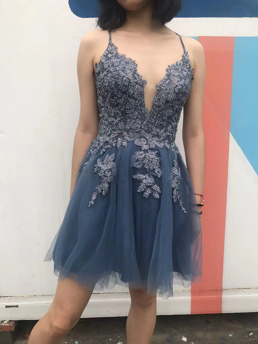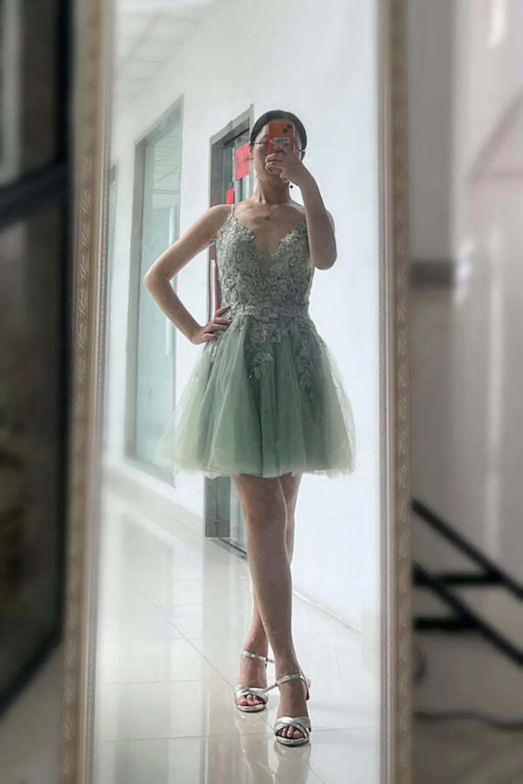 Spaghetti Straps Tulle Light Purple Short Homecoming Dress with Appliques