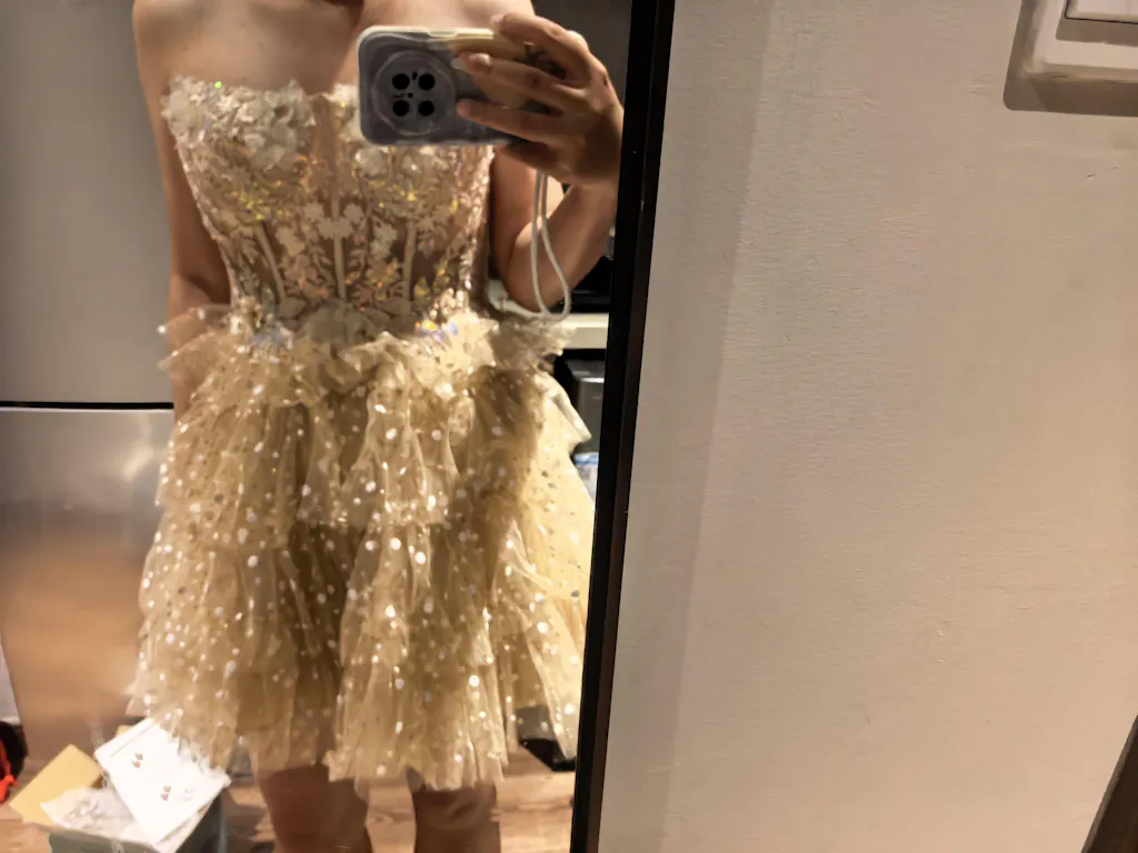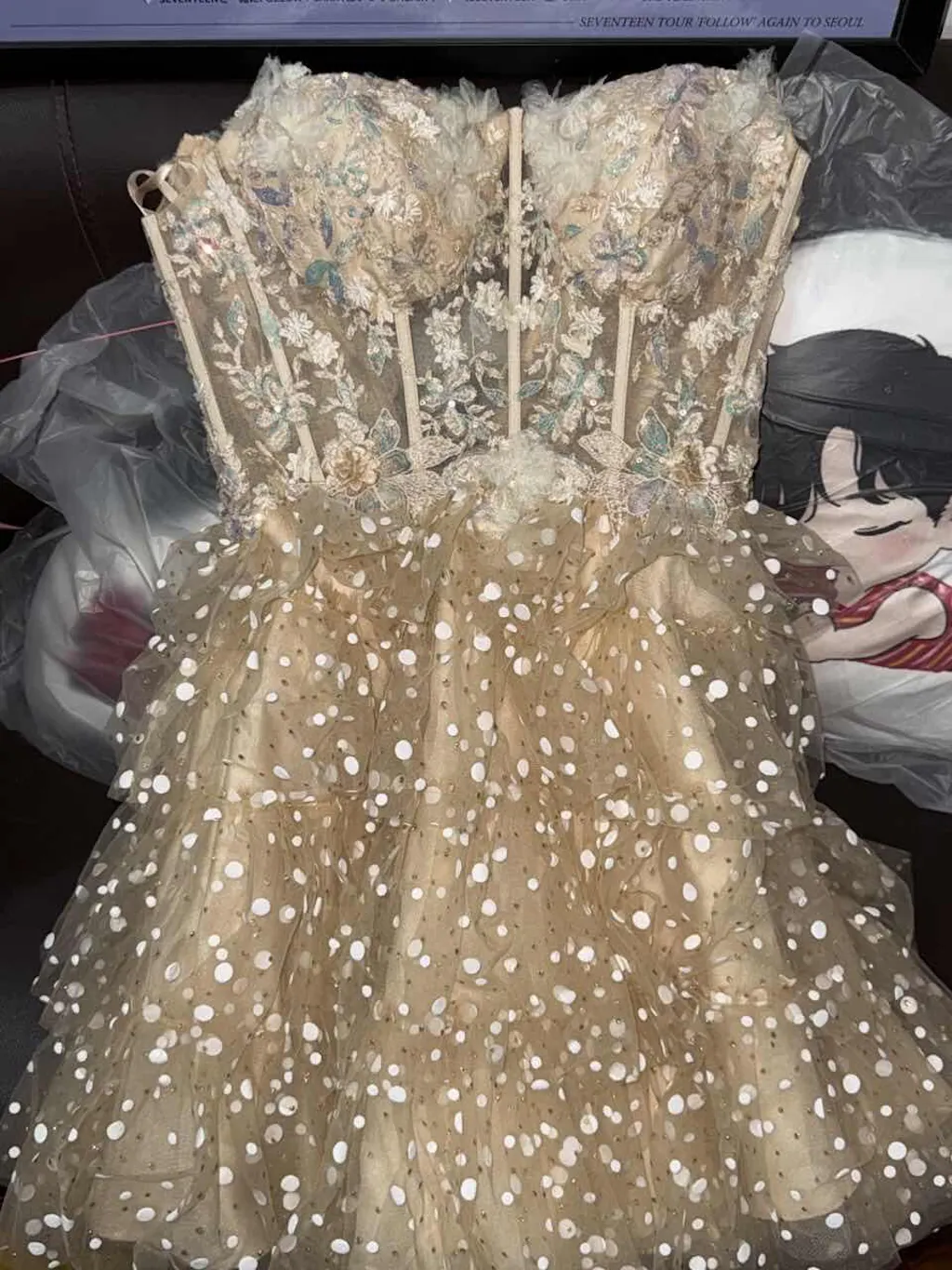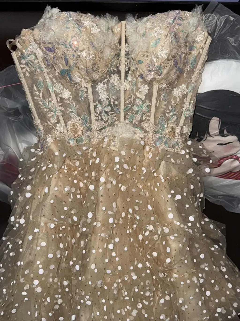 Sparkly Champagne Floral Short Corset Polka Dots Homecoming Dress