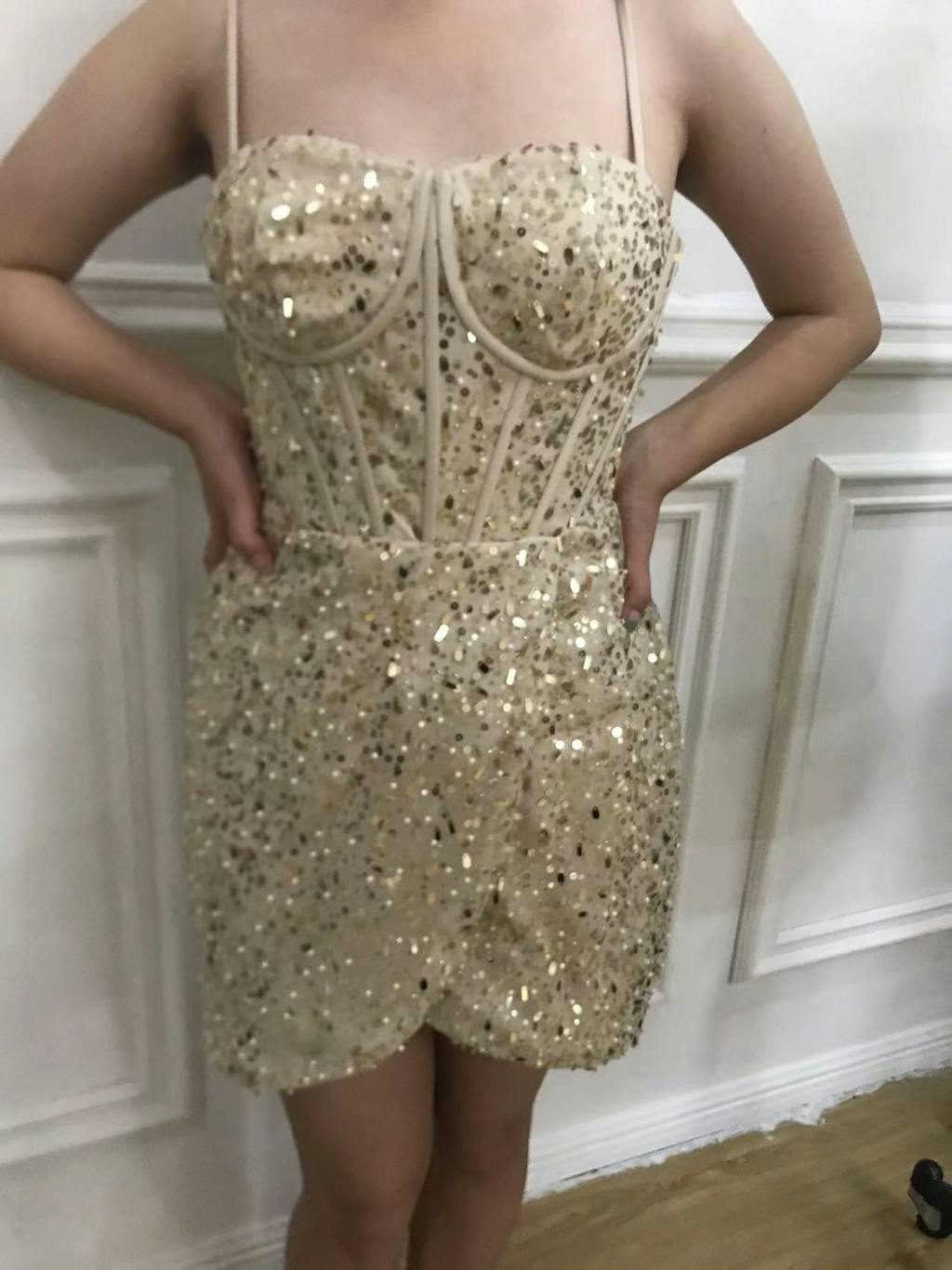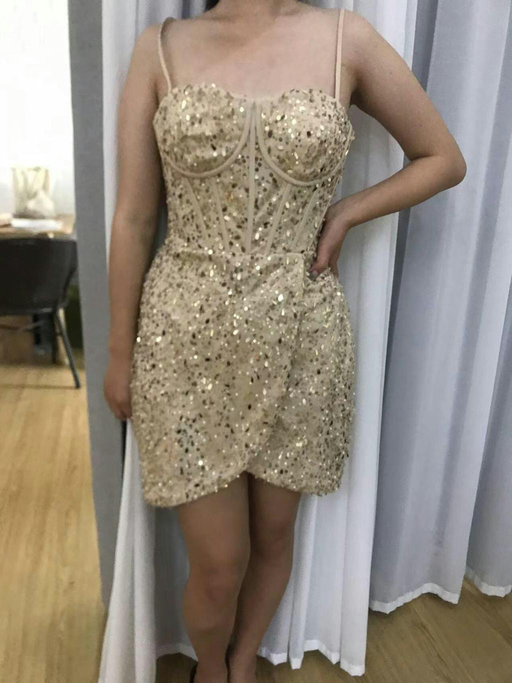 Sparkly Golden Spaghetti Straps Bodycon Homecoming Dress with Sequins