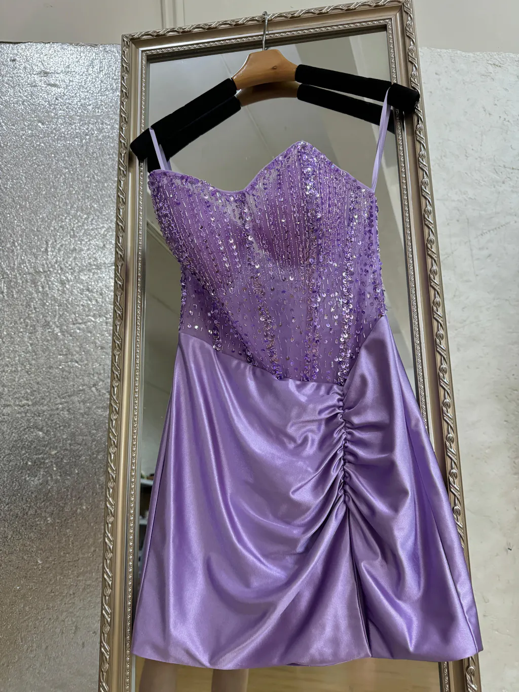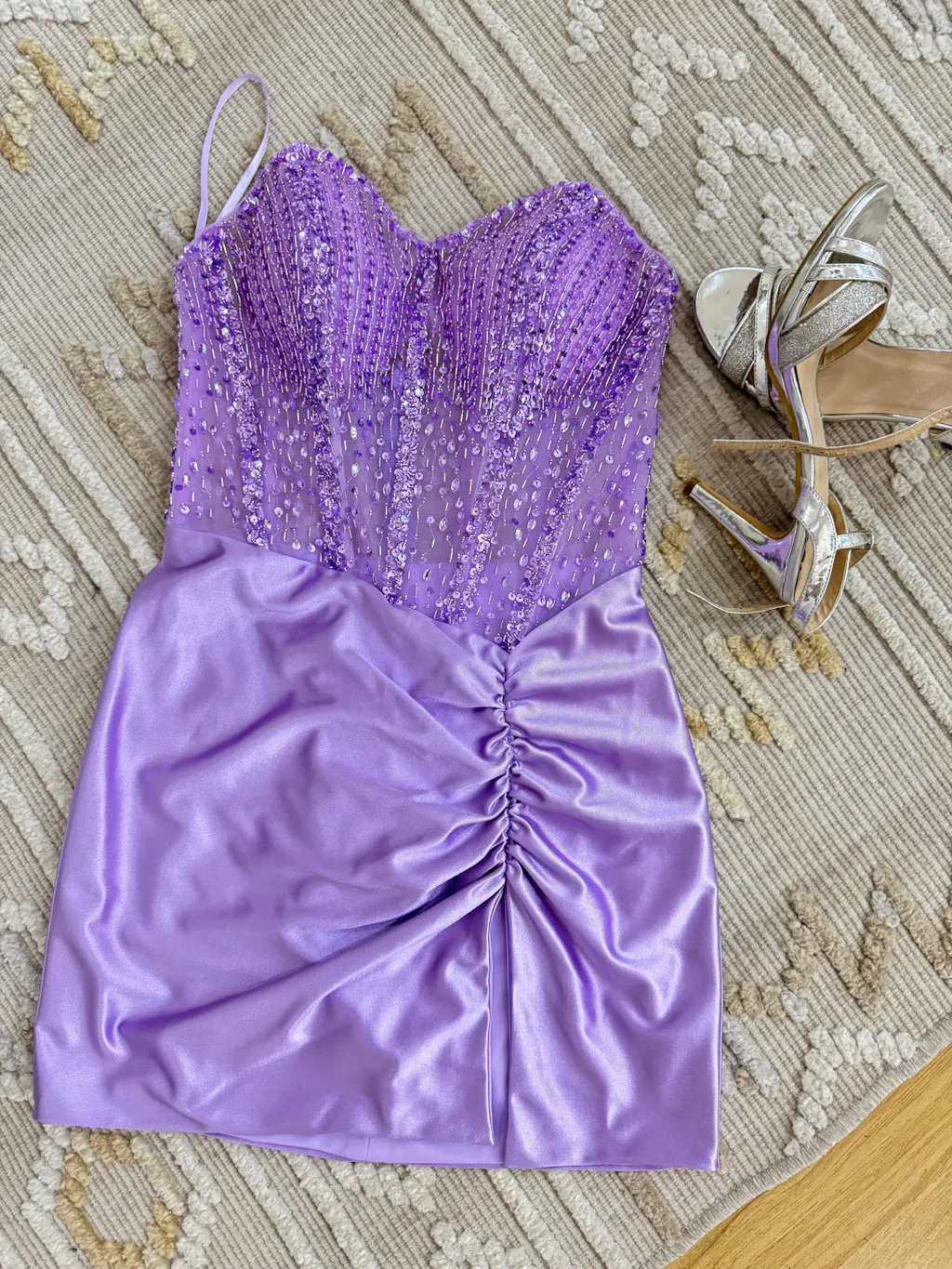 Sparkly Lilac Corset Strapless Tight Short Homecoming Dress with Slit