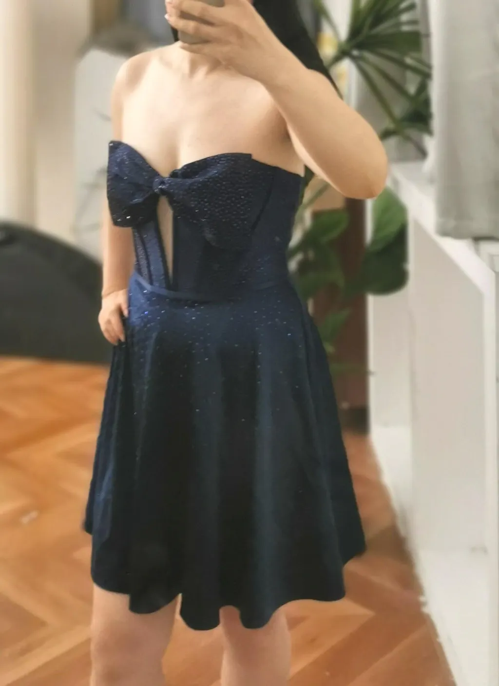Sparkly Navy Beaded Corset Strapless Short Homecoming Dress With Bow