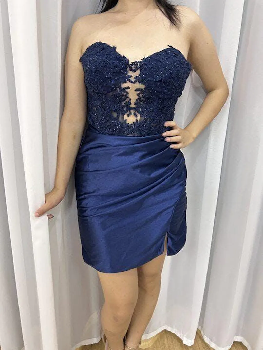 Details: Glamorously dance the night away in our Sparkly Navy Tight Homecoming Dress! Its strapless design and tight, short fit will show off your figure, while the lace detailing adds an elegant touch. With a playful slit, you'll be sure to turn heads on the dance floor. Perfect for a fun and flirty evening.