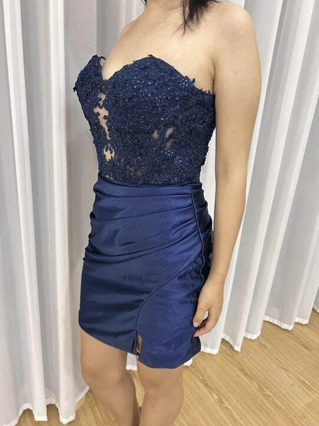 Details: Glamorously dance the night away in our Sparkly Navy Tight Homecoming Dress! Its strapless design and tight, short fit will show off your figure, while the lace detailing adds an elegant touch. With a playful slit, you'll be sure to turn heads on the dance floor. Perfect for a fun and flirty evening.