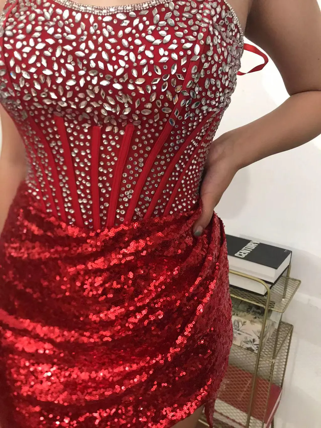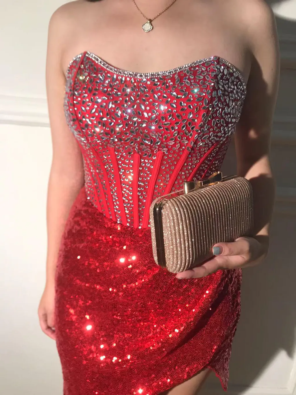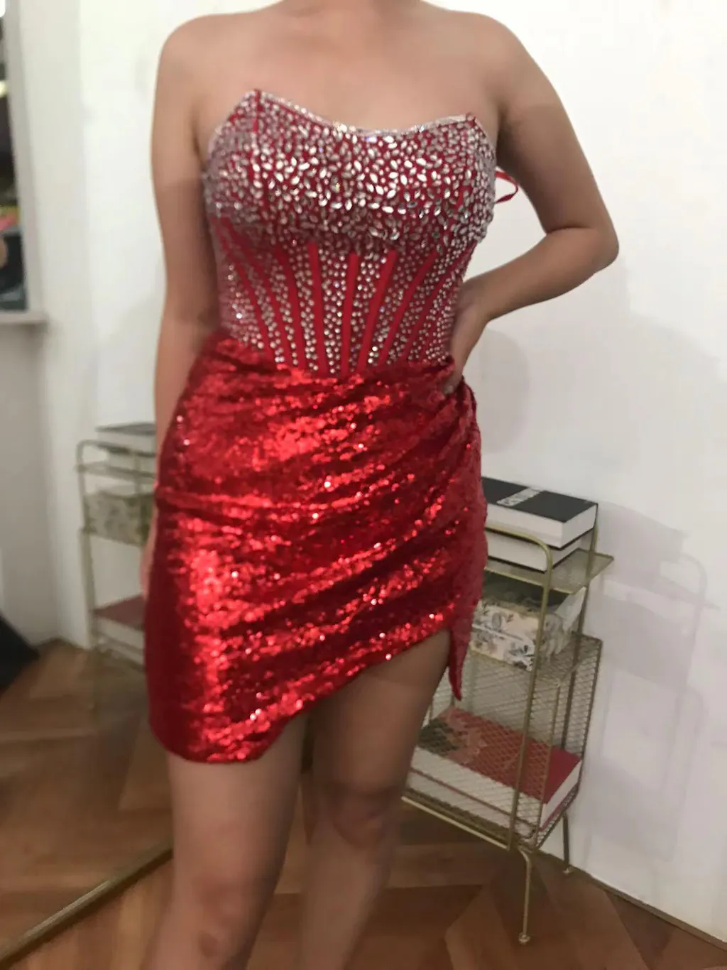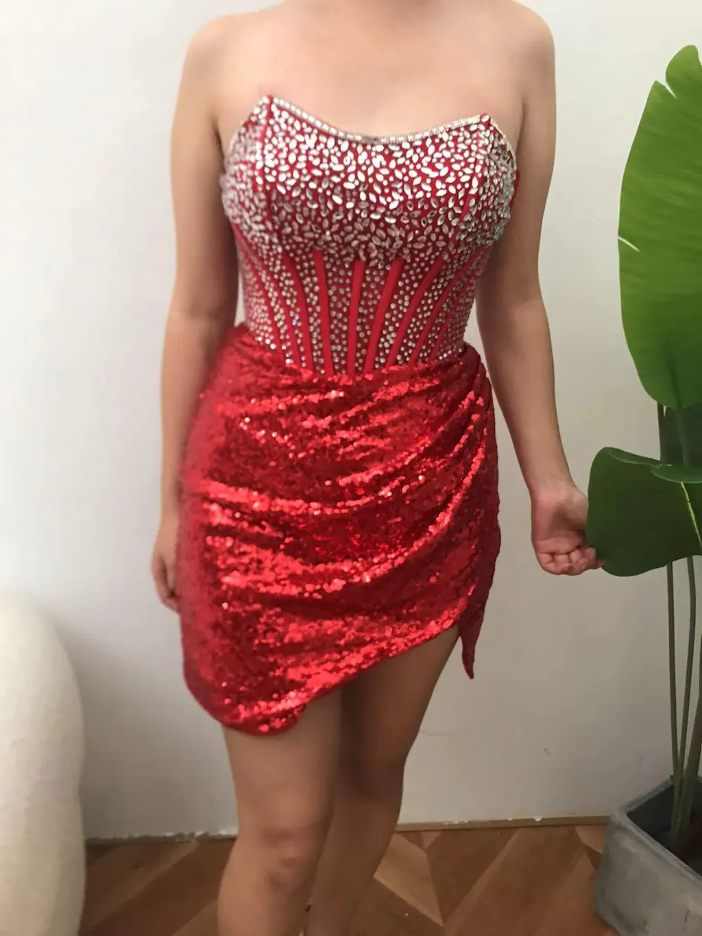 Sparkly Red Strapless Corset Sequined Beaded Tight Homecoming Dress with Slit