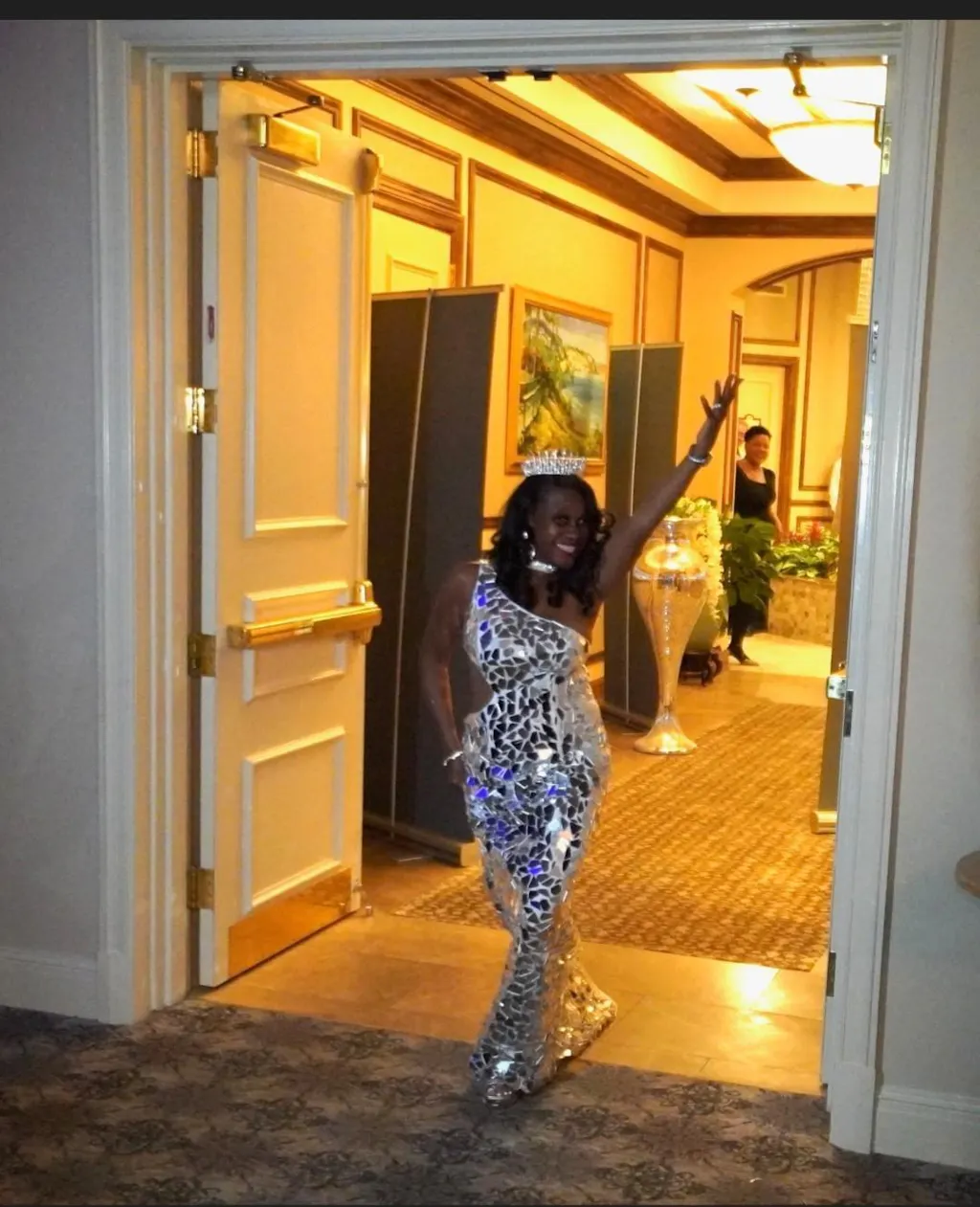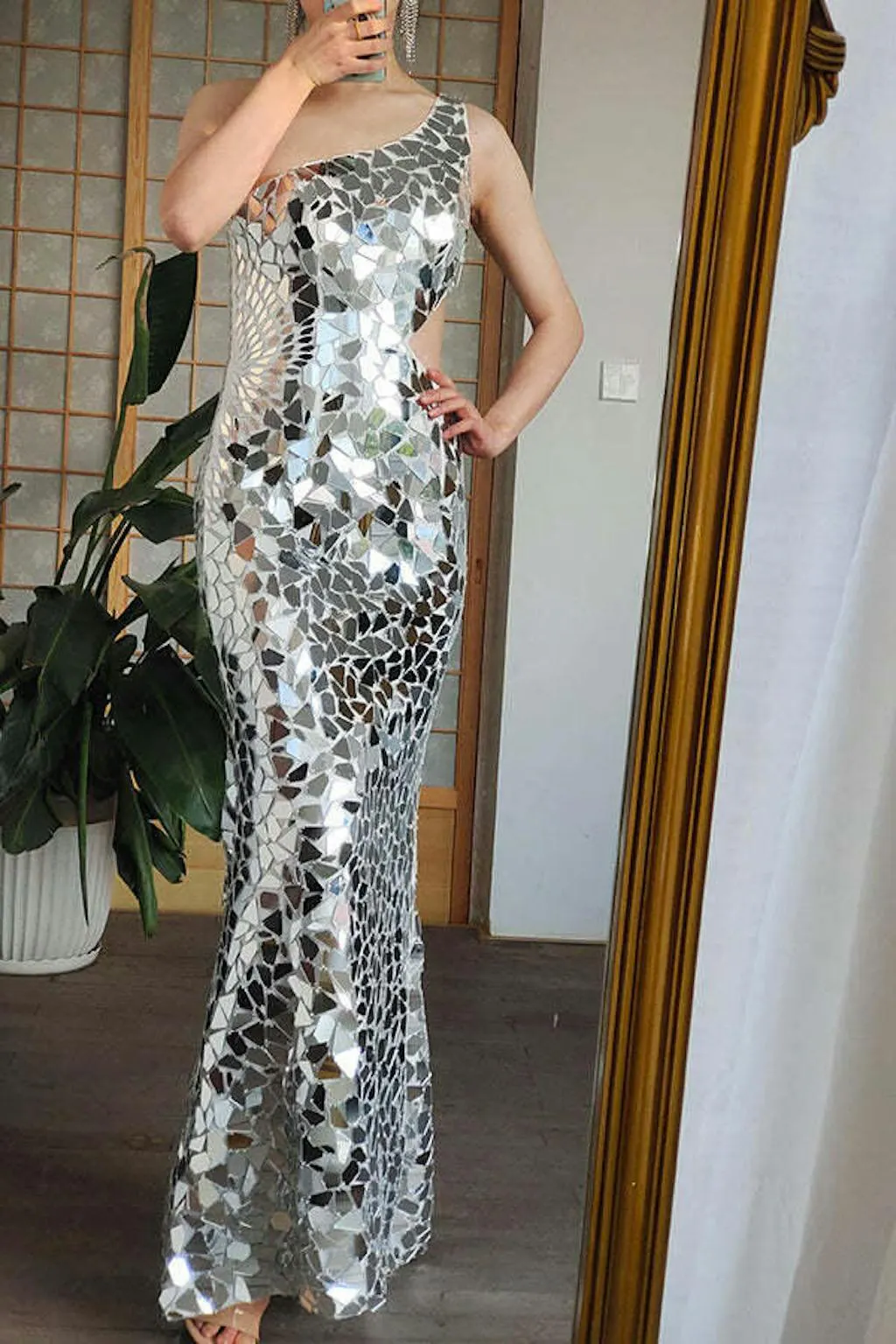 Sparkly Silver Mirror One Shoulder Prom Dress with Hollow-out