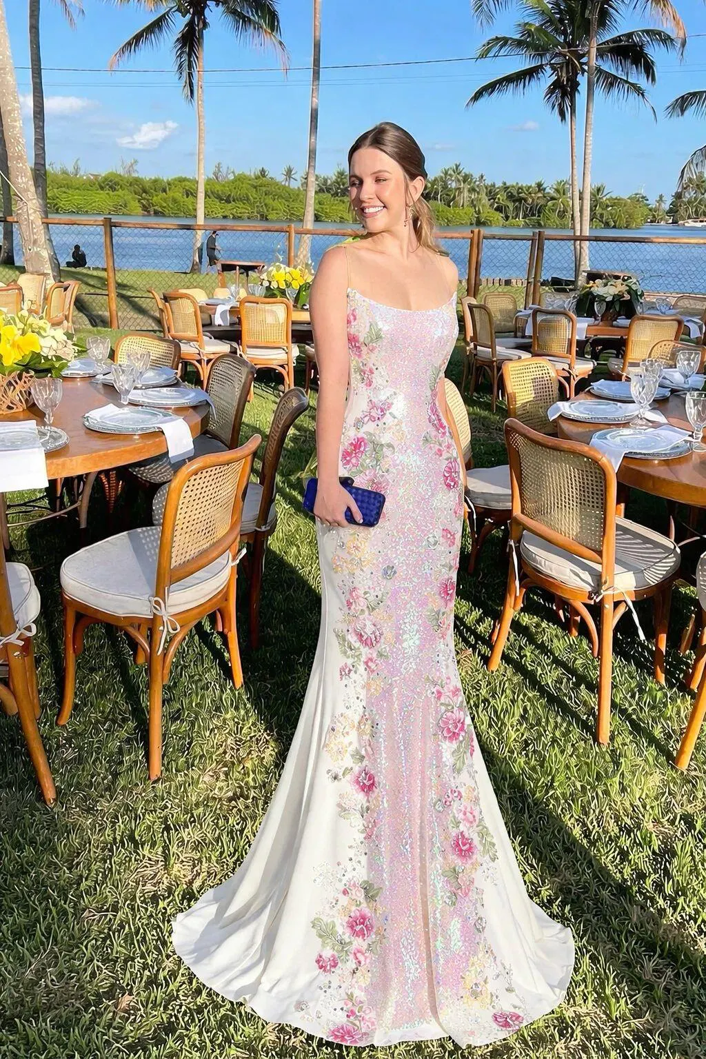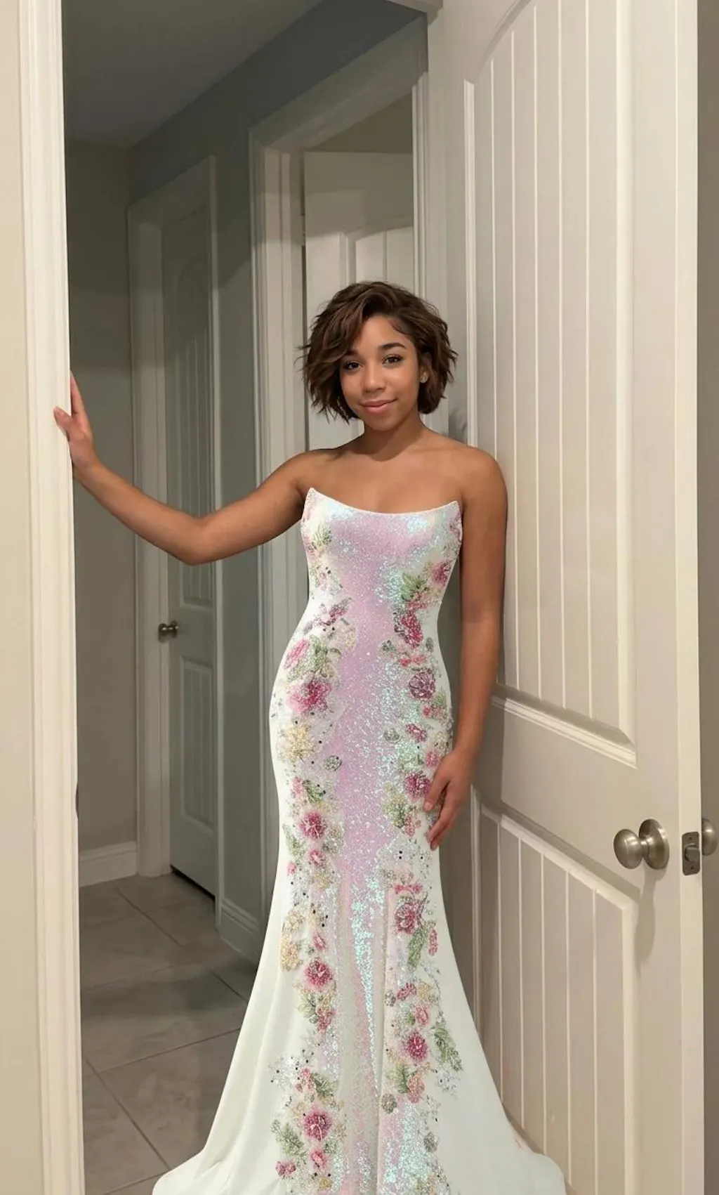Details: Sparkle and shine in our Sparkly White Floral Strapless Mermaid Long Prom Dress! This stunning dress features delicate embroidered pink floral details that will make you feel like a true princess. The mermaid cut highlights your curves while the sparkly sequins add a touch of glamour. Be the star of the night in this elegant and unique dress.