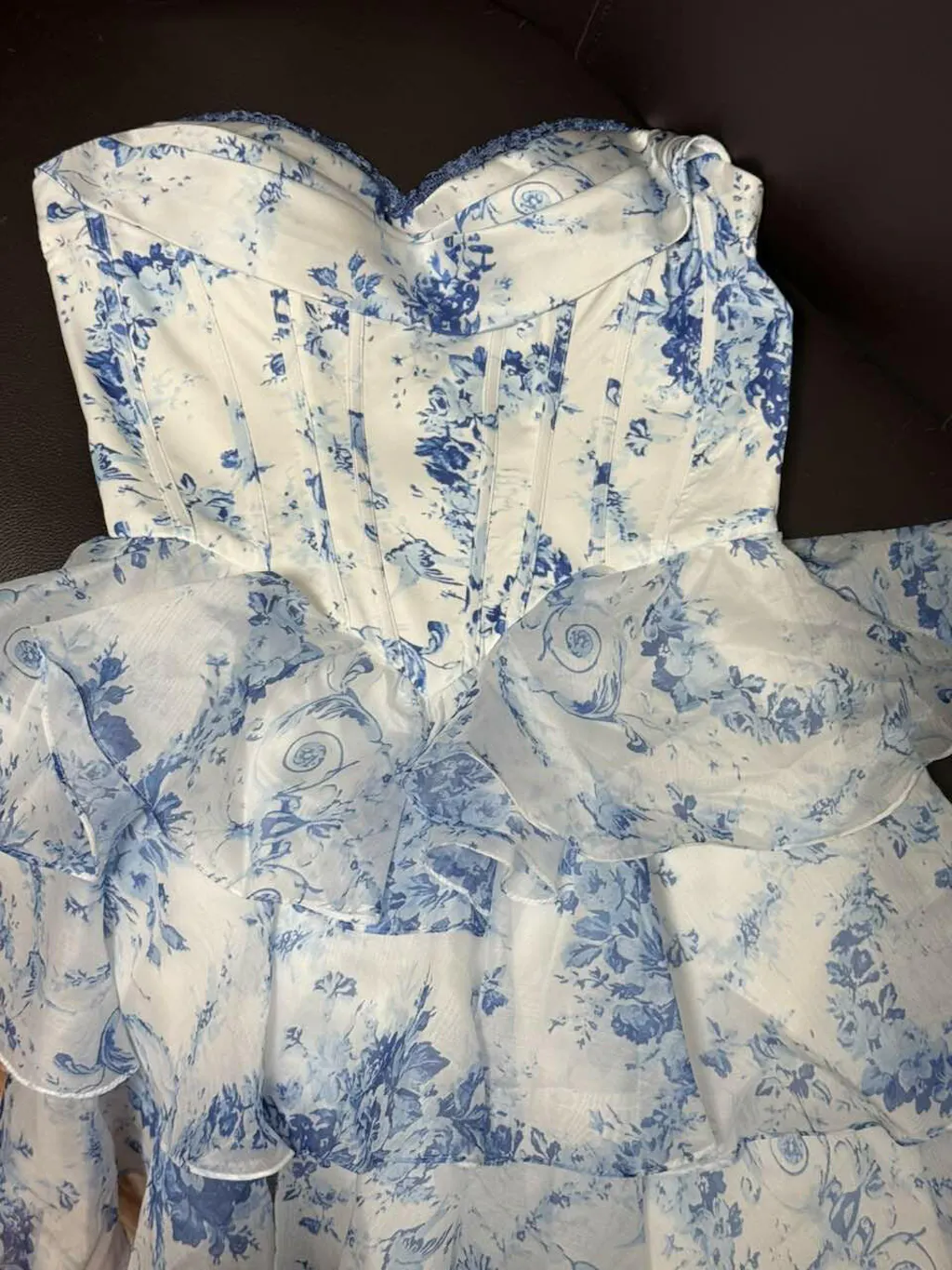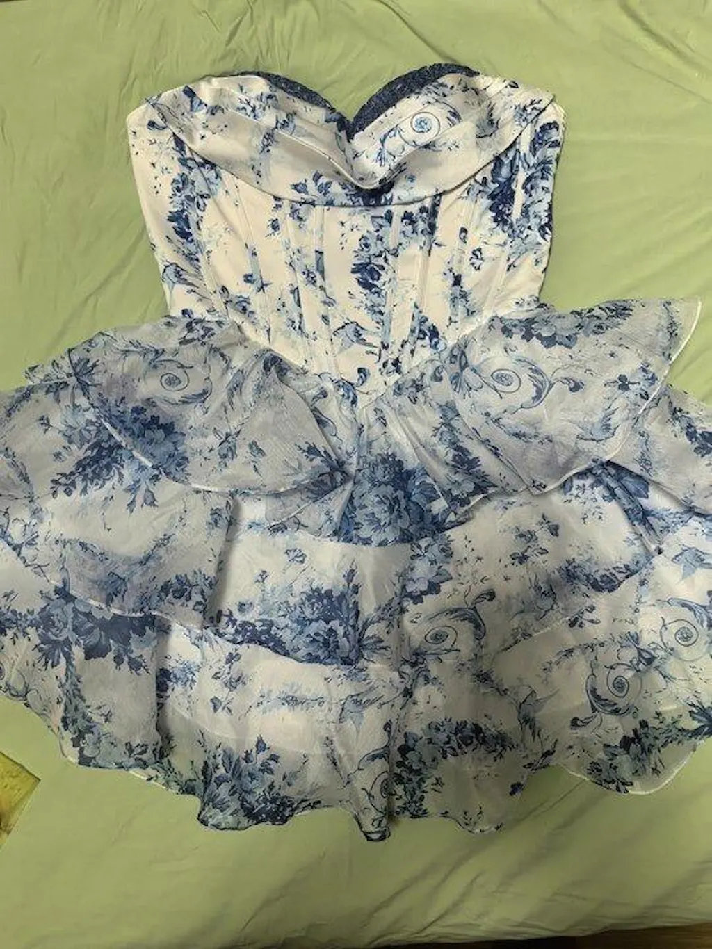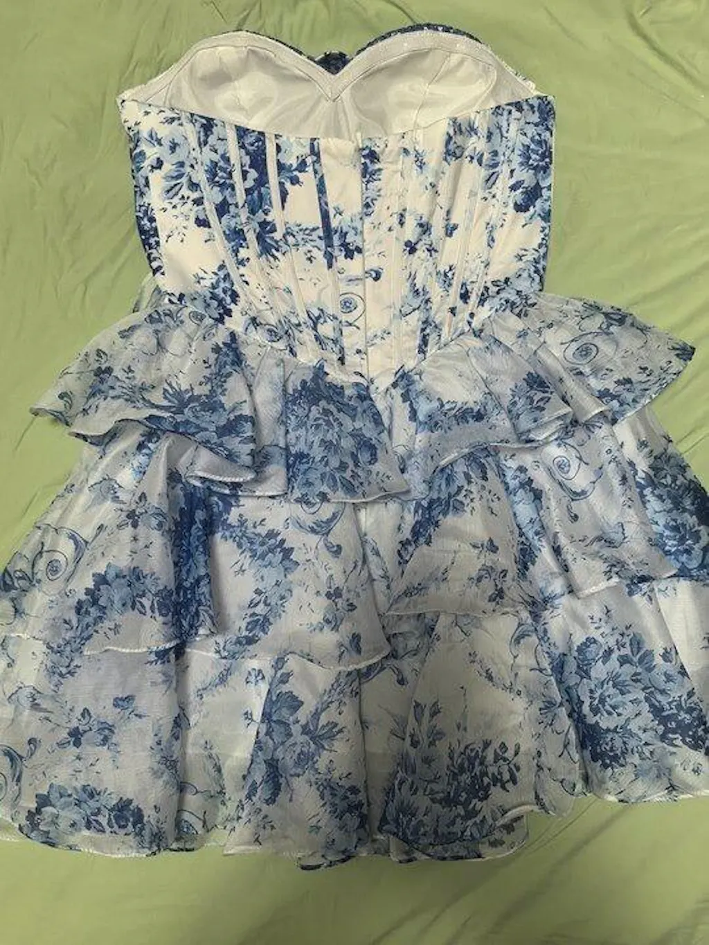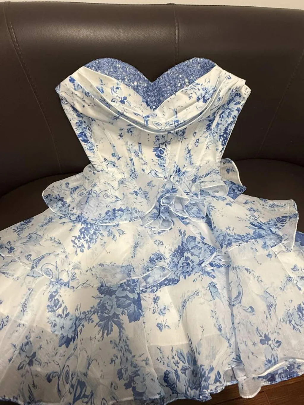 White and Blue Floral Sweetheart Corset Short Homecoming Dress with Ruffles